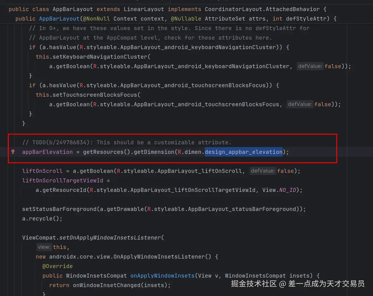 AppBarLayout的阴影是通过R.dimen.design_appbar_elevation来设置的,并没有通过自定义属性来设置。AppBarLayout的源码注释有一个TODO:This should be a customizable attribute,说明未来是google应该会把这个参数改为自定义的属性。