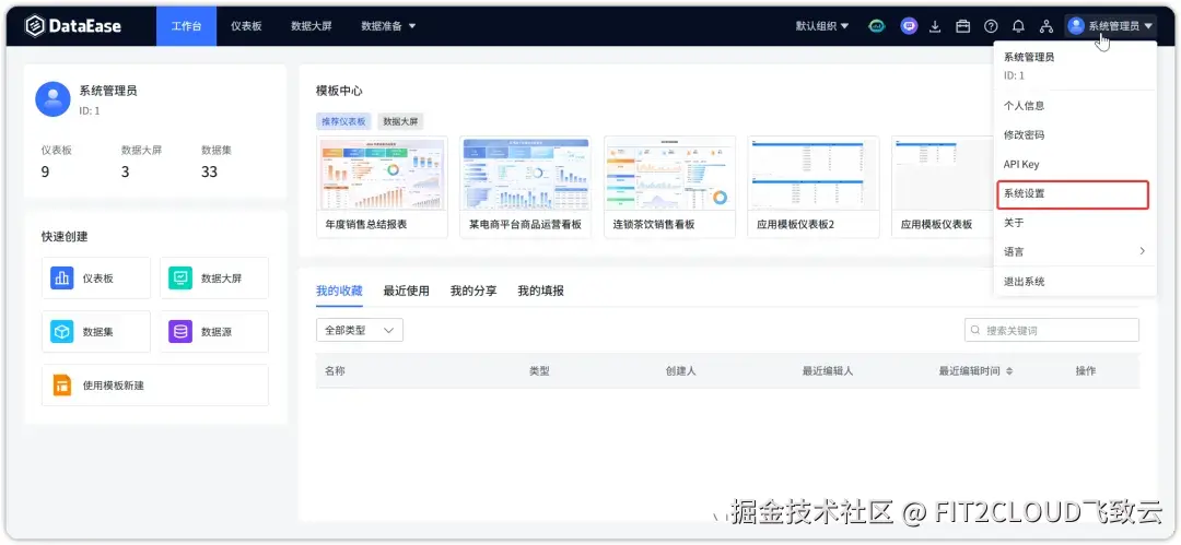 ① 进入DataEase“系统设置”页面;