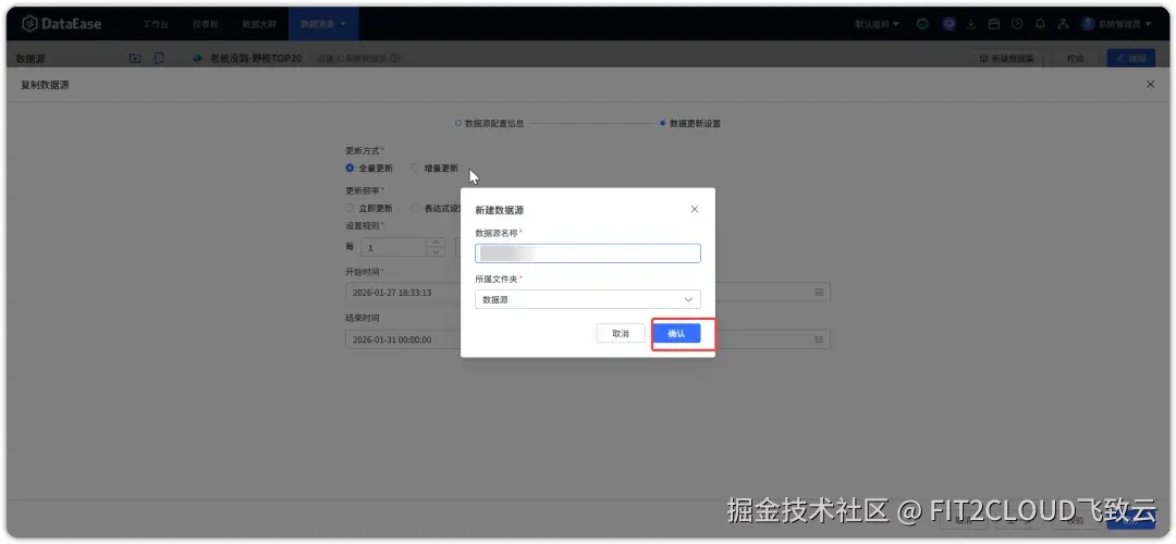 ⑥ 现在我们进行数据更新设置。此处设置数据更新方式为“全量更新”,更新频率为“简单重复”,将更新的“设置规则”调整为“每1分钟更新一次”,并且配置好开始时间与结束时间,然后点击“检验”按钮,如果校验无误即可保存数据源。