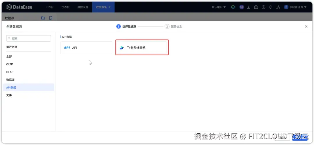 ① 成功安装插件后,返回DataEase的“数据源“页面。点击“数据准备”菜单下的“新建数据源”按钮,进入“创建数据源”页面。在“API数据”分类下,可以看到数据源选项中增加了一个名为“飞书多维表格”的选项;