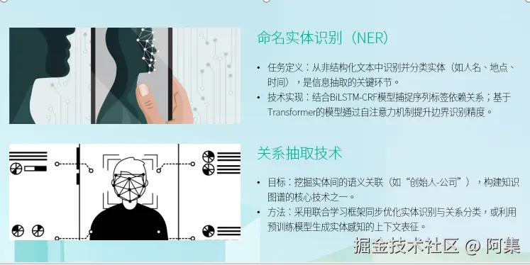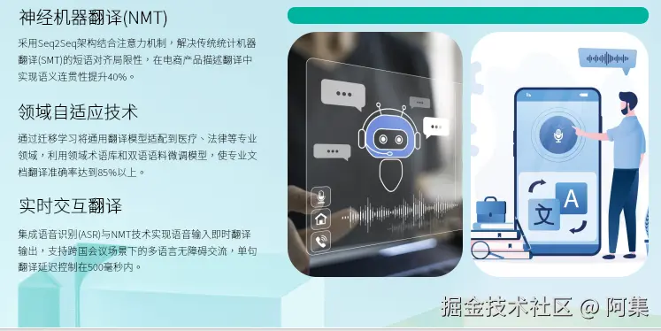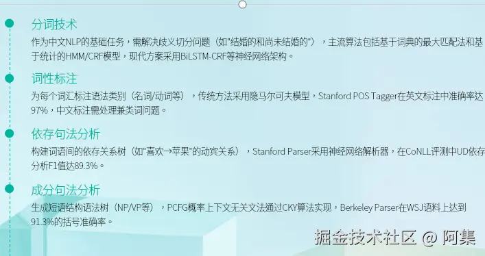 技术实现路径,NLP系统通过结合规则引擎(如正则匹配)与统计学习方法(如神经网络),将非结构化的文本/语音数据转化为结构化表示。典型流程包括词嵌入(Word2Vec)、序列标注(BiLSTM-CRF)和生成式建模(Transformer),最终应用于翻译、摘要等下游任务。