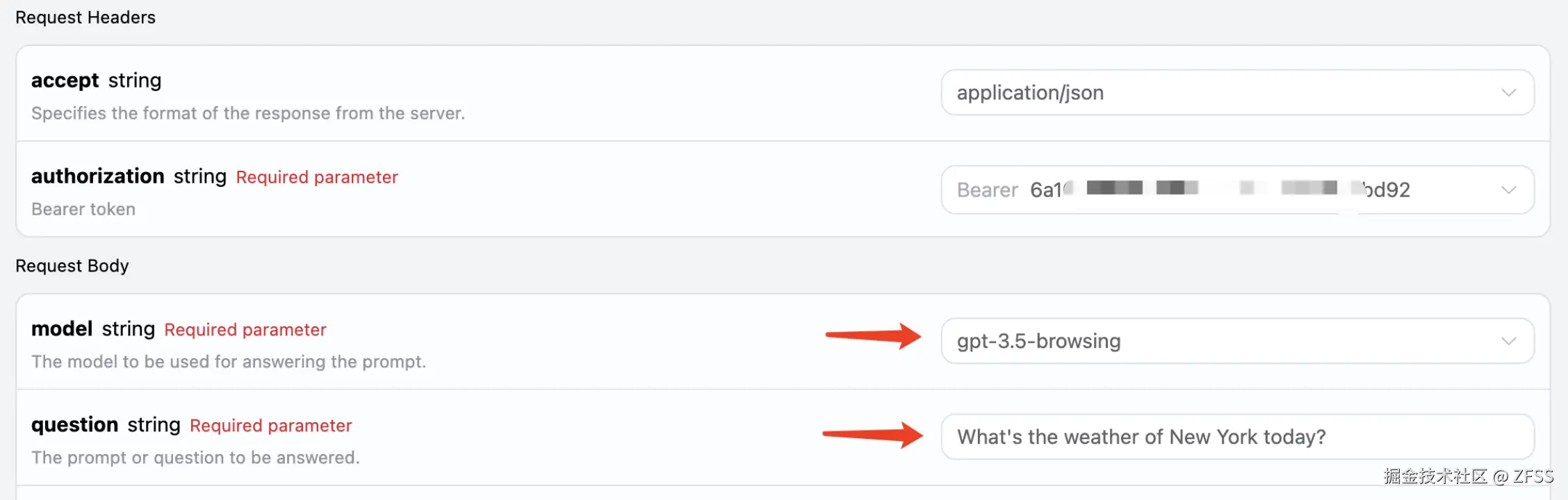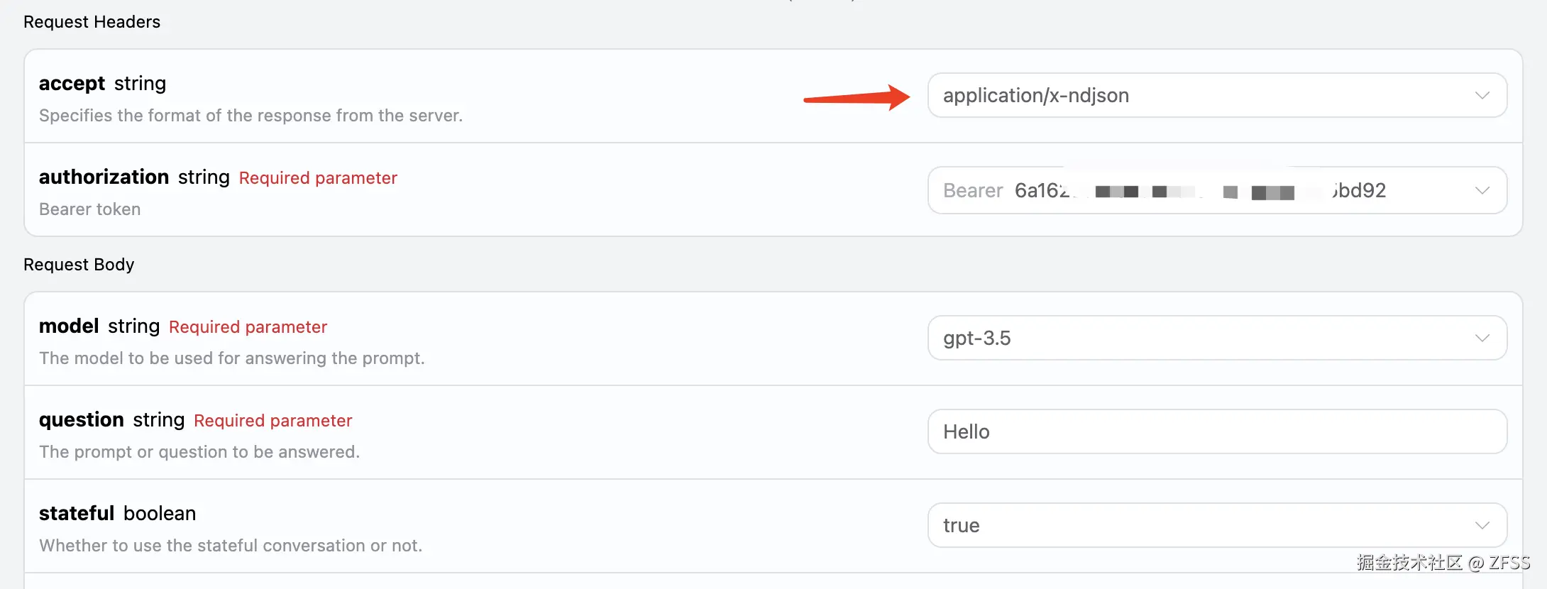 accept:想要接收怎样格式的响应结果,这里填写为application/json,即 JSON 格式。authorization:调用 API 的密钥,申请之后可以直接下拉选择。