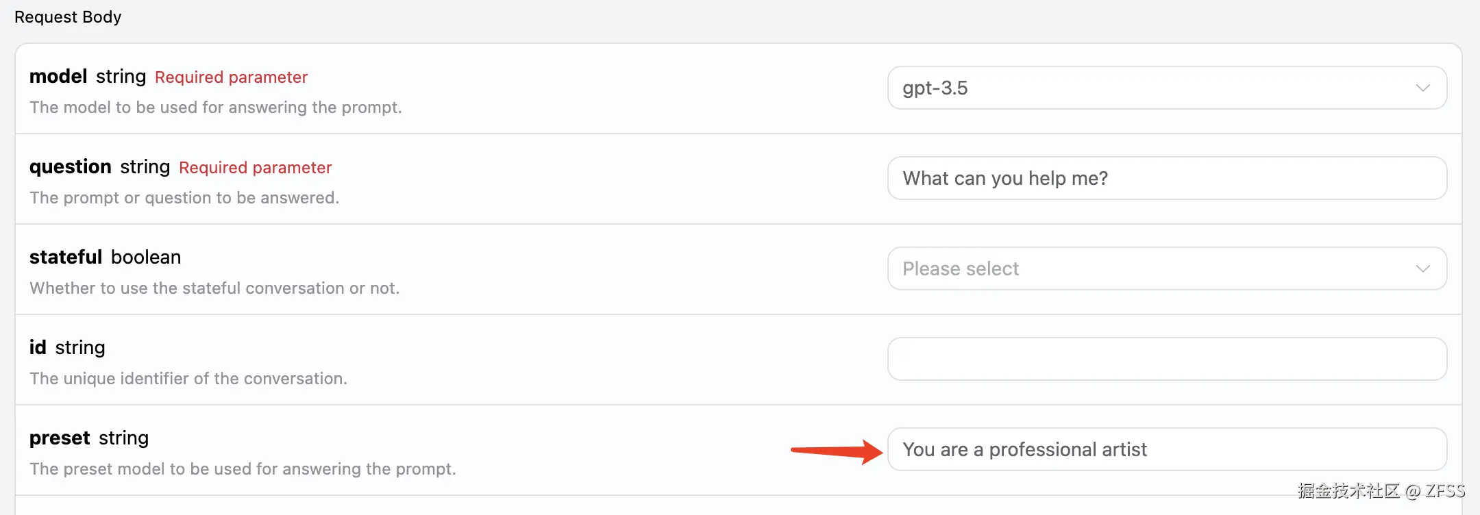 这里我们额外添加 preset 字段,内容为 You are a professional artist,如图所示: