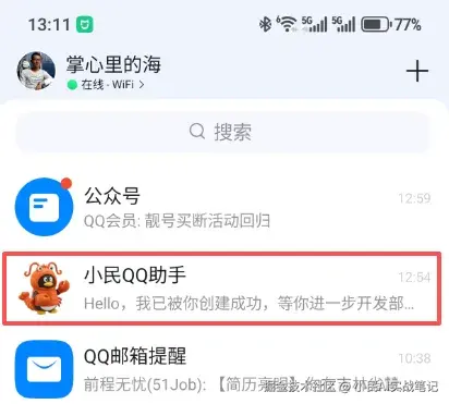 此刻打开手机QQ,我们已经可以在消息列表里看到刚刚创建的机器人了👇