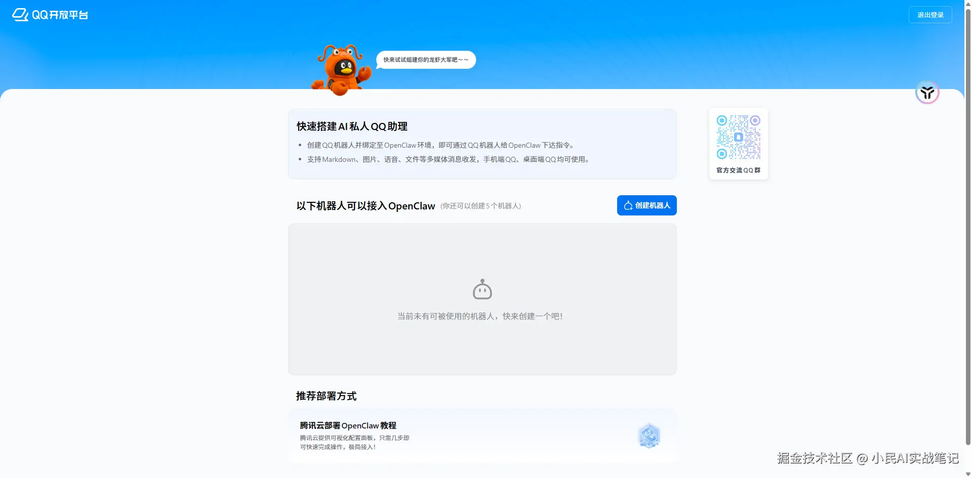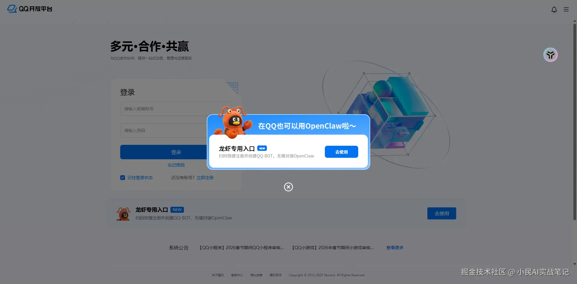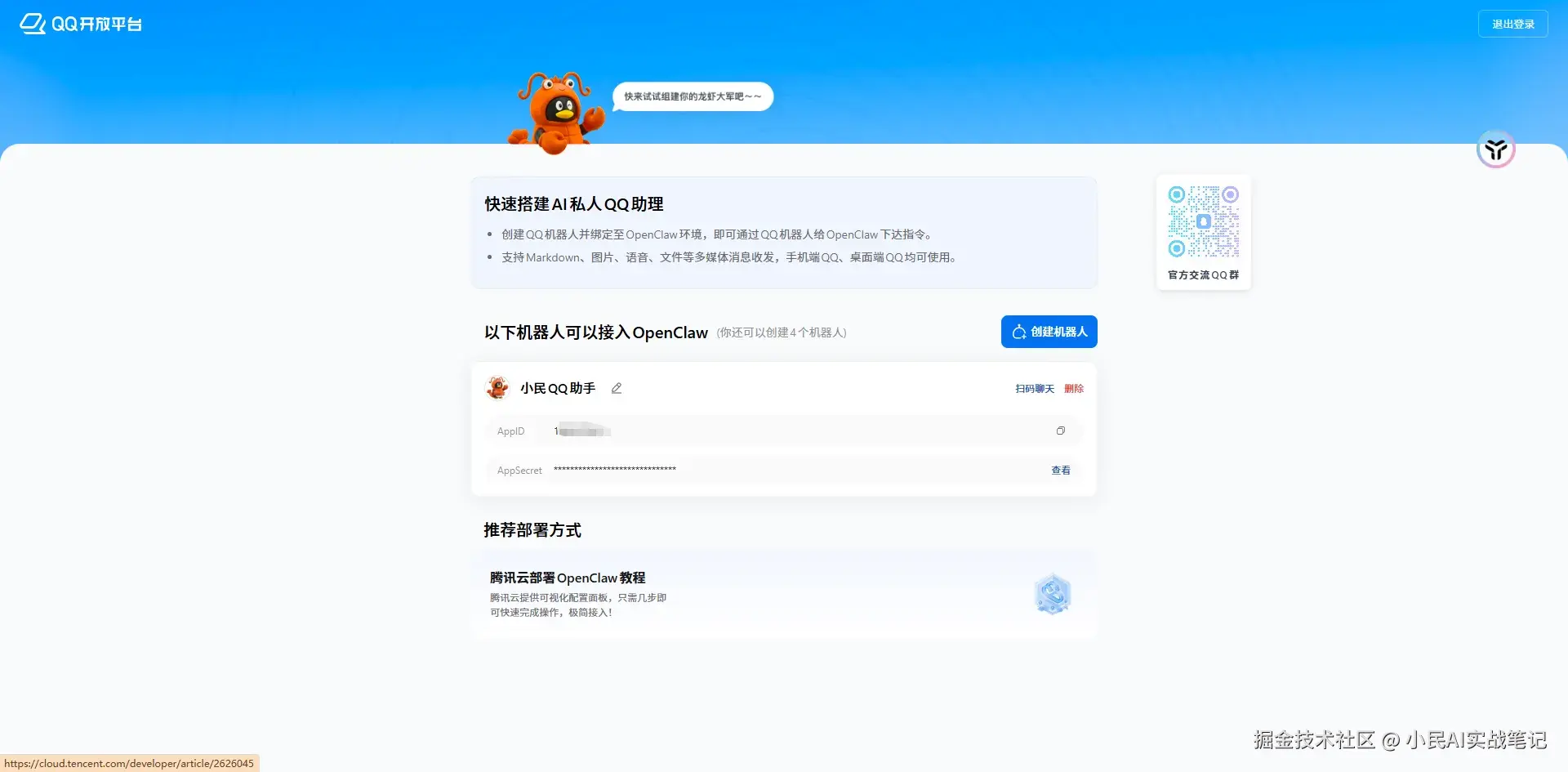 QQ开放平台现在为OpenClaw设置了「龙虾专用入口」,整个流程非常顺畅