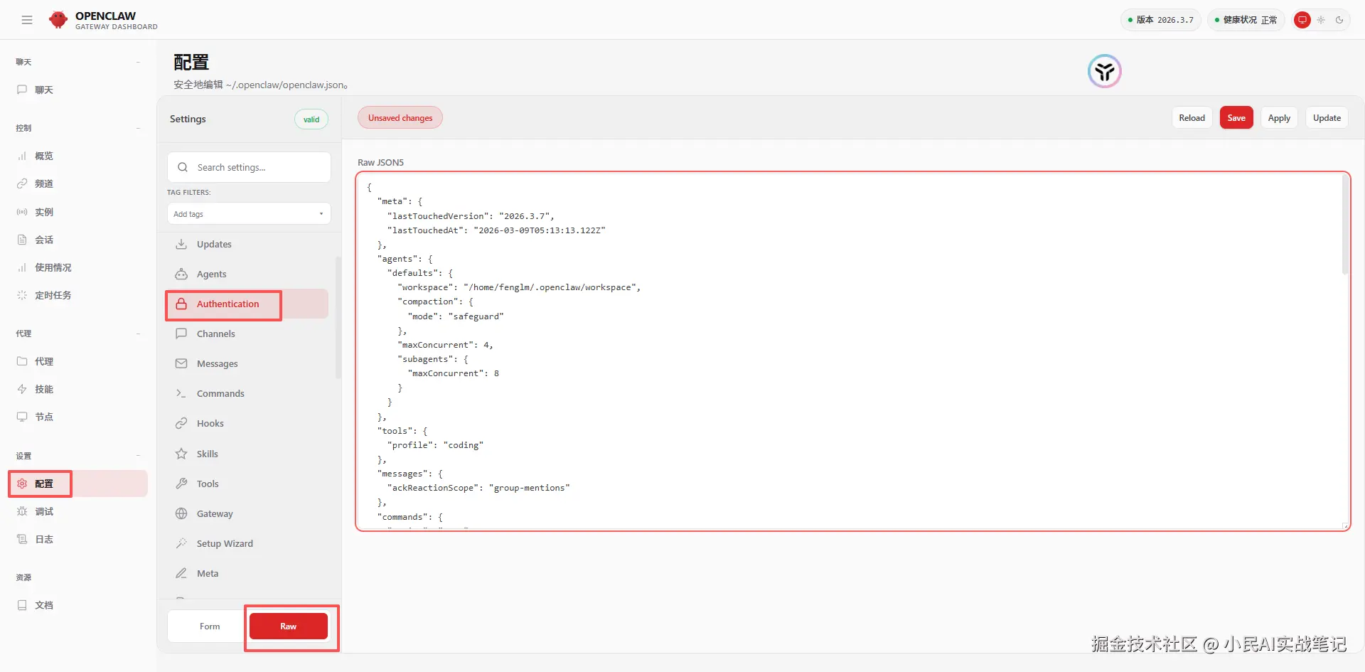 在左侧菜单栏,依次点击 配置➔Raw(见下图),进入JSON编辑模式。