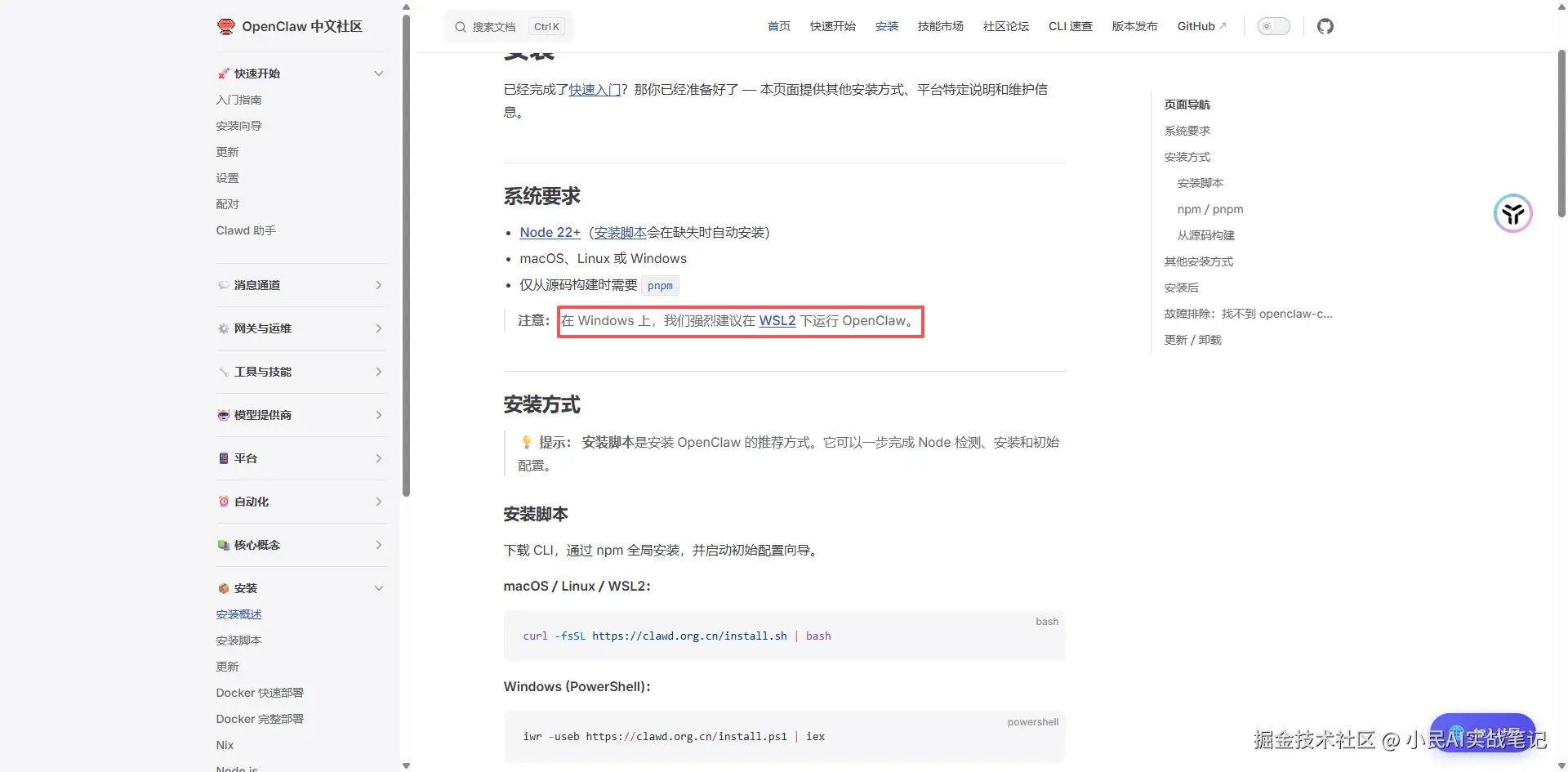 WSL2安装指南:docs.openclaw.ai/zh-CN/platf…