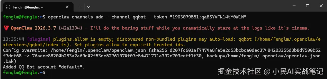 openclaw channels add --channel qqbot --token "你的AppID:你的AppSecret"