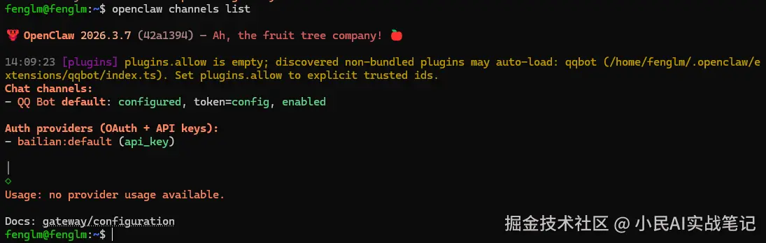 输出中显示Auth providers里有bailian:default,说明模型认证也成功了✌️