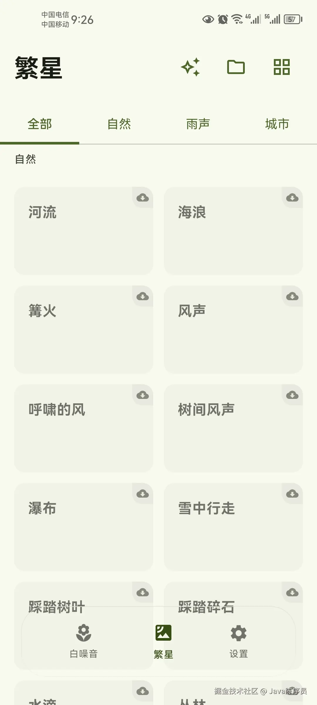 - 内置多种白噪音:提供雨声、篝火、雷声、森林鸟鸣、猫咪呼噜、键盘等多种自然/场景音效,分类清晰(自然/雨声/城市/河流等),无需联网直接播放