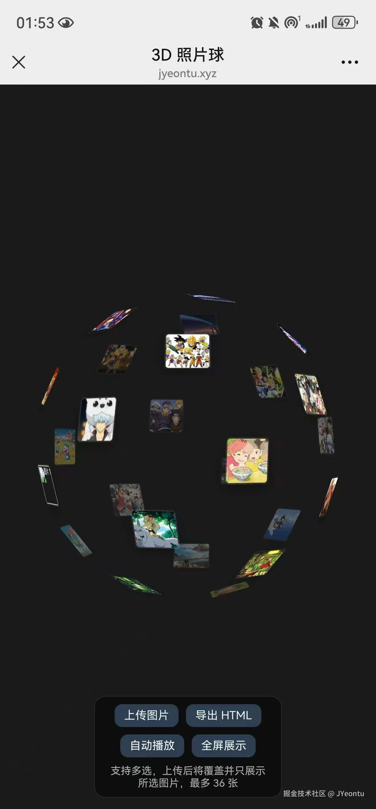 - 🌍 照片均匀分布在 3D 球面上,自动缓慢旋转展示