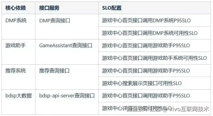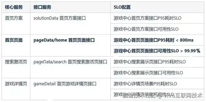 在游戏中心业务中,需要从推荐、dmp标签、游戏资讯、大数据四个业务方获取核心数据,那么这四个服务相关接口的SLO就需要作为核心依赖观测项。