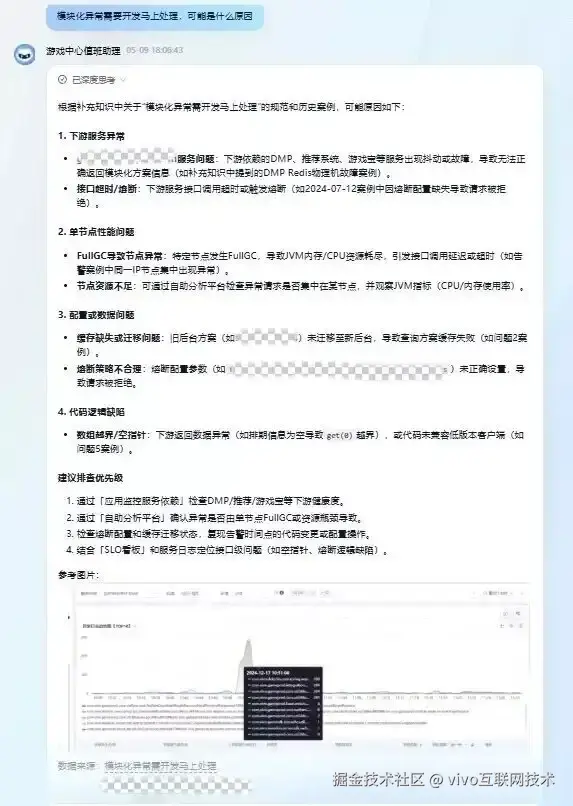 在专家经验的沉淀上,对于业务、SLO等相关告警,通过处理流程建议文档、文档知识库、日志知识库,构建agent值班助手来共享团队知识。