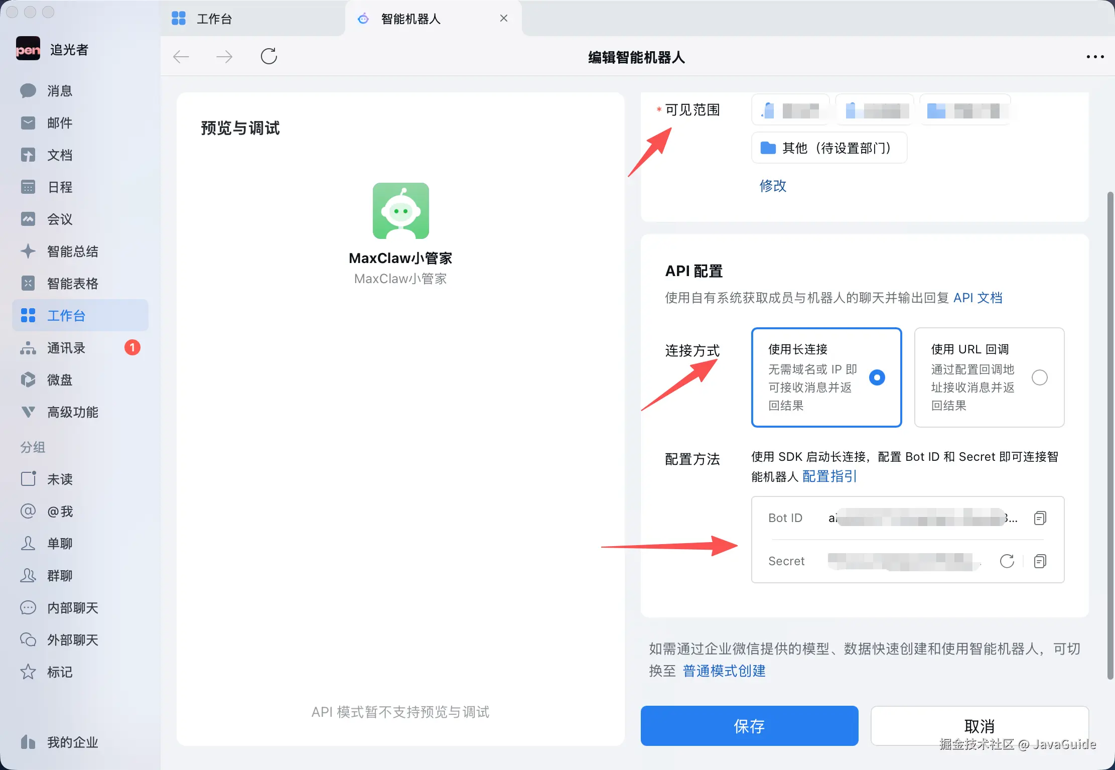 然后按照它的提示操作即可。大致流程是去企微管理后台创建一个应用(使用 API 模式、长连接),把 AppID 和 Secret 填进去。