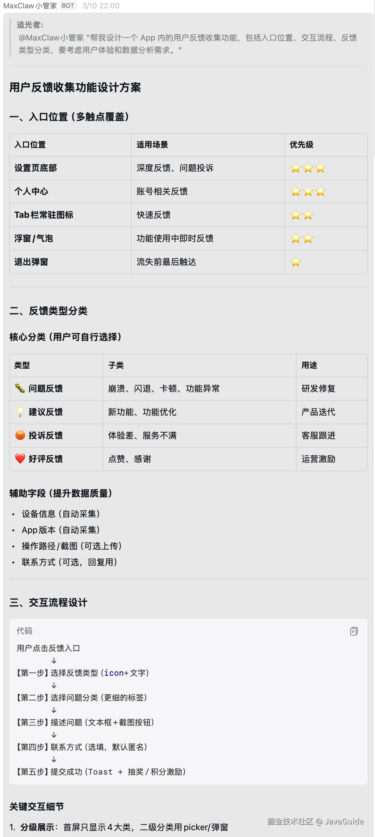 从入口设计(放在设置页/个人中心/长按触发)、交互流程(几步完成)、反馈类型(Bug 反馈/功能建议/投诉举报)到数据分析维度,都给你列得清清楚楚。