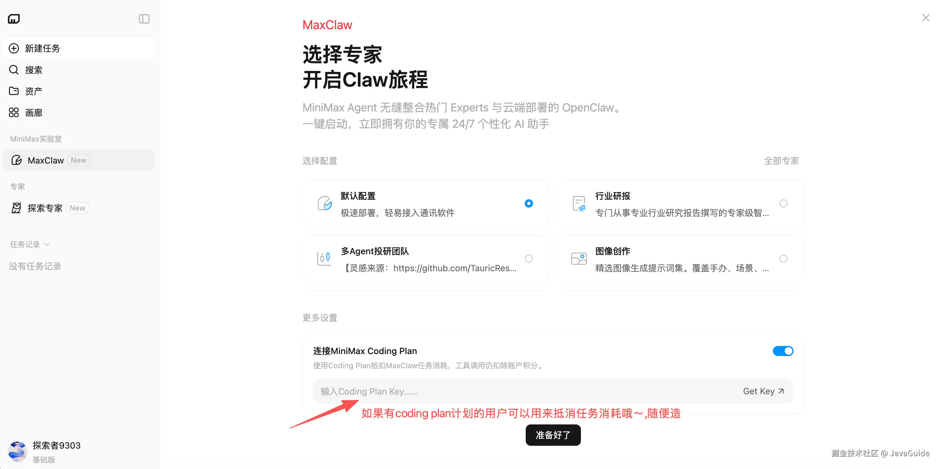 原本的 OpenClaw 需要你自己搭环境、配模型,现在 MiniMax 直接帮你跑在云端容器里,用的是他们自家的模型,API Key 也省得自己配置。