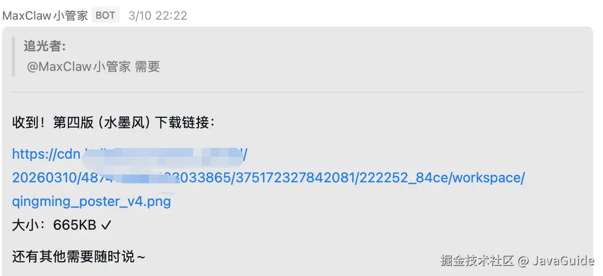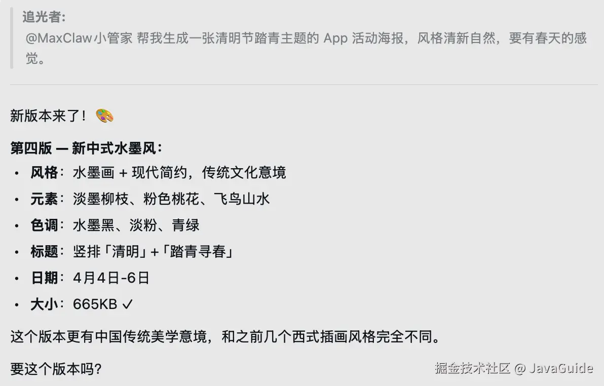 是不是比纯文字建议更直观?运营和设计同学有福了,以后临时要个活动海报、Banner 图,不用等设计师排期,直接让 MaxClaw 先出一版,不满意再改。