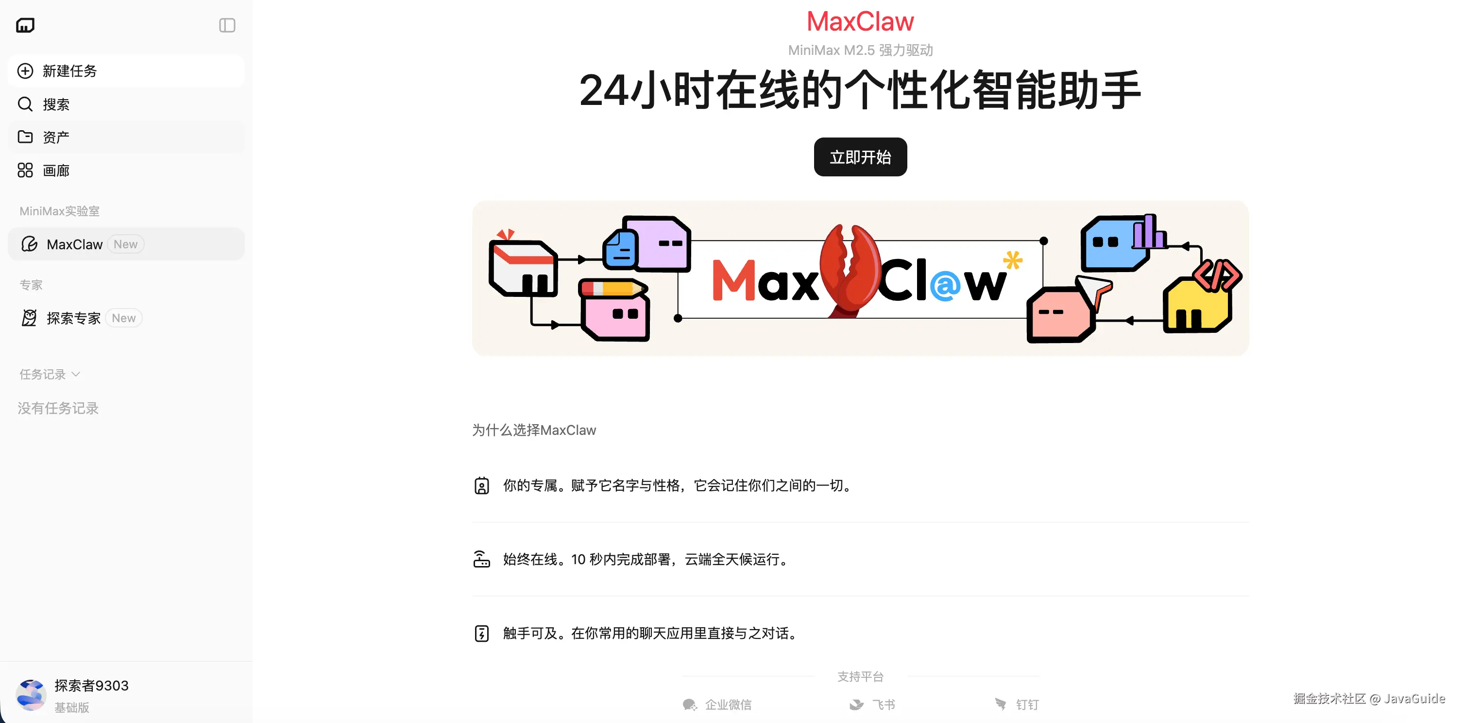 1、打开 MiniMax Agent 官网,左侧选择 MaxClaw,点击"立即开始"。