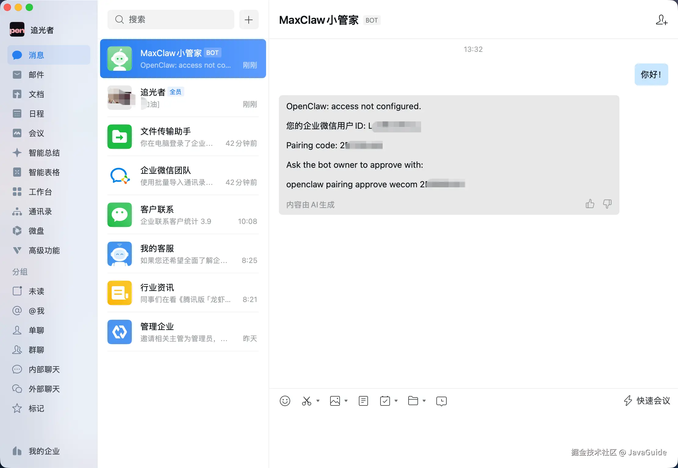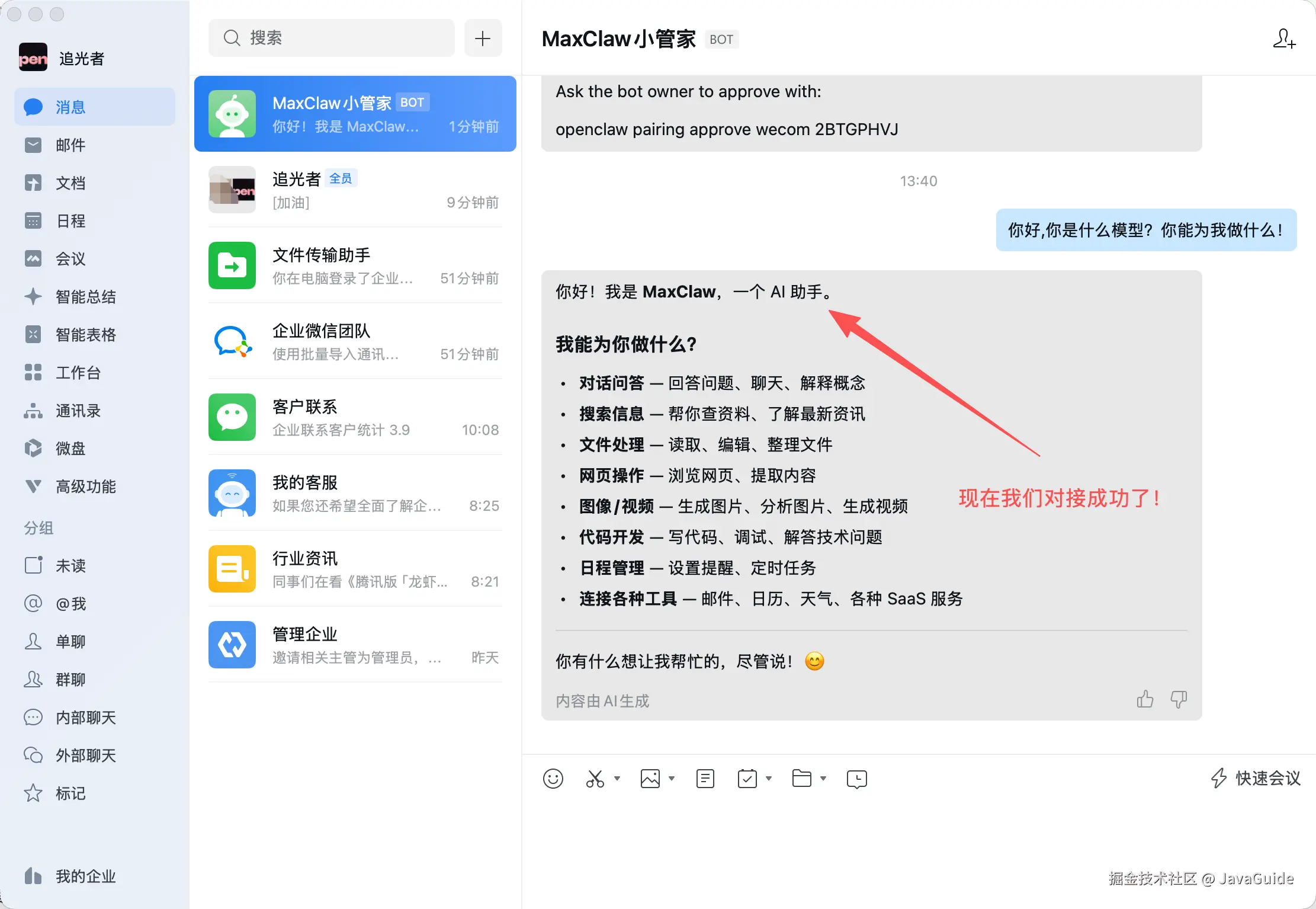 配置搞定,下面直接上实测!看看在企微里,MaxClaw 能帮我们干点啥。