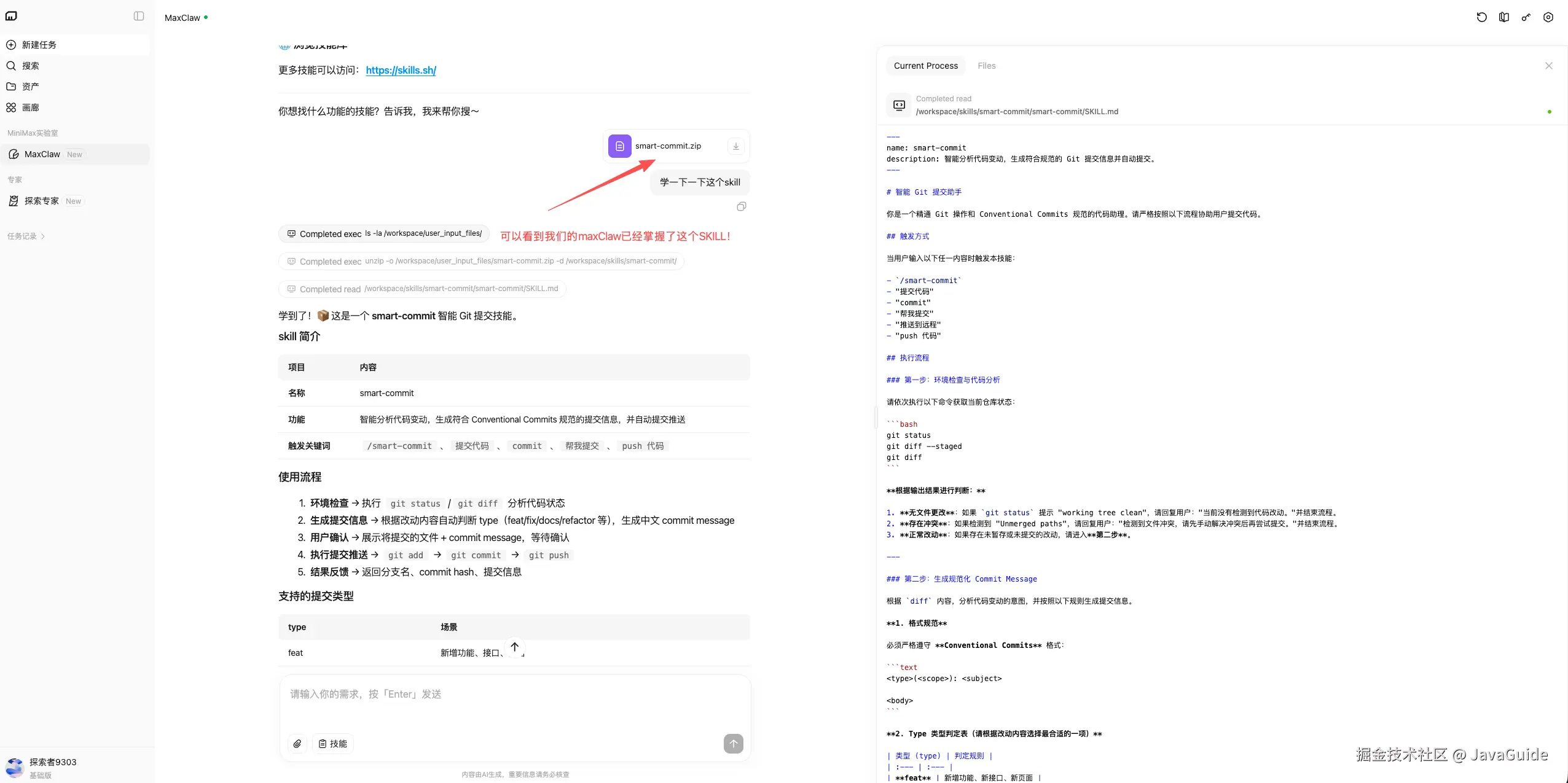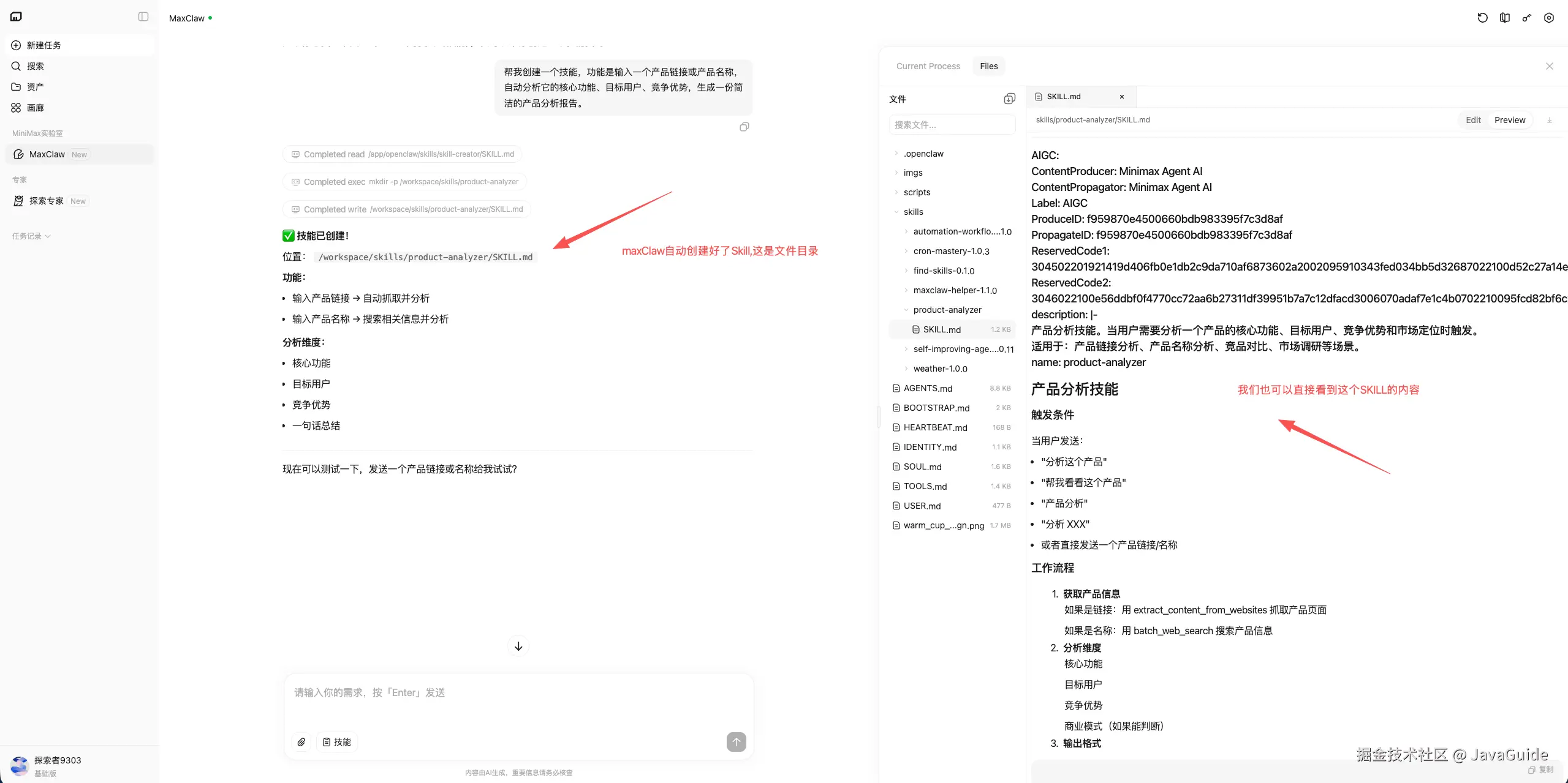 MaxClaw 会和你确认需求细节,然后自动生成完整的 Skill 逻辑:
