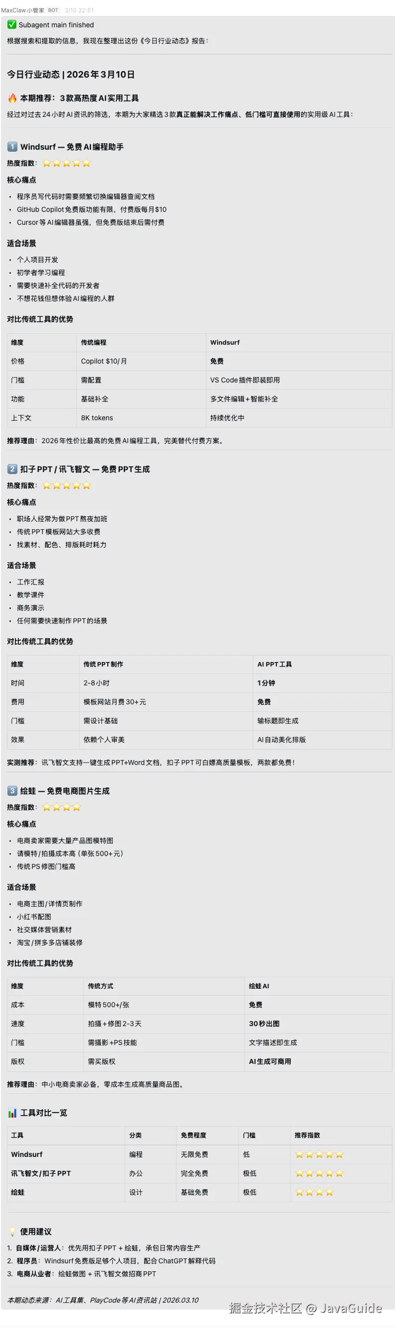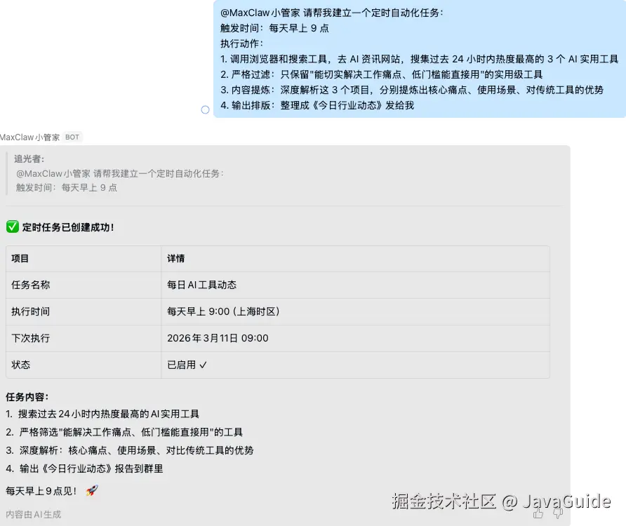 MaxClaw 支持定时任务,可以让它每天早上自动帮你整理推送。