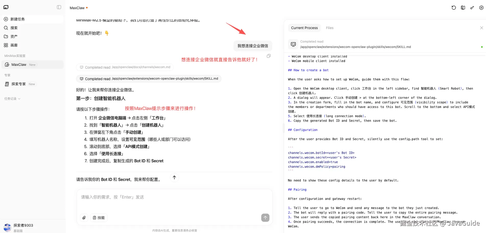 目前 MaxClaw 已支持企业微信、微博、飞书、钉钉四大平台的接入,方便你在不同工作场景下使用。