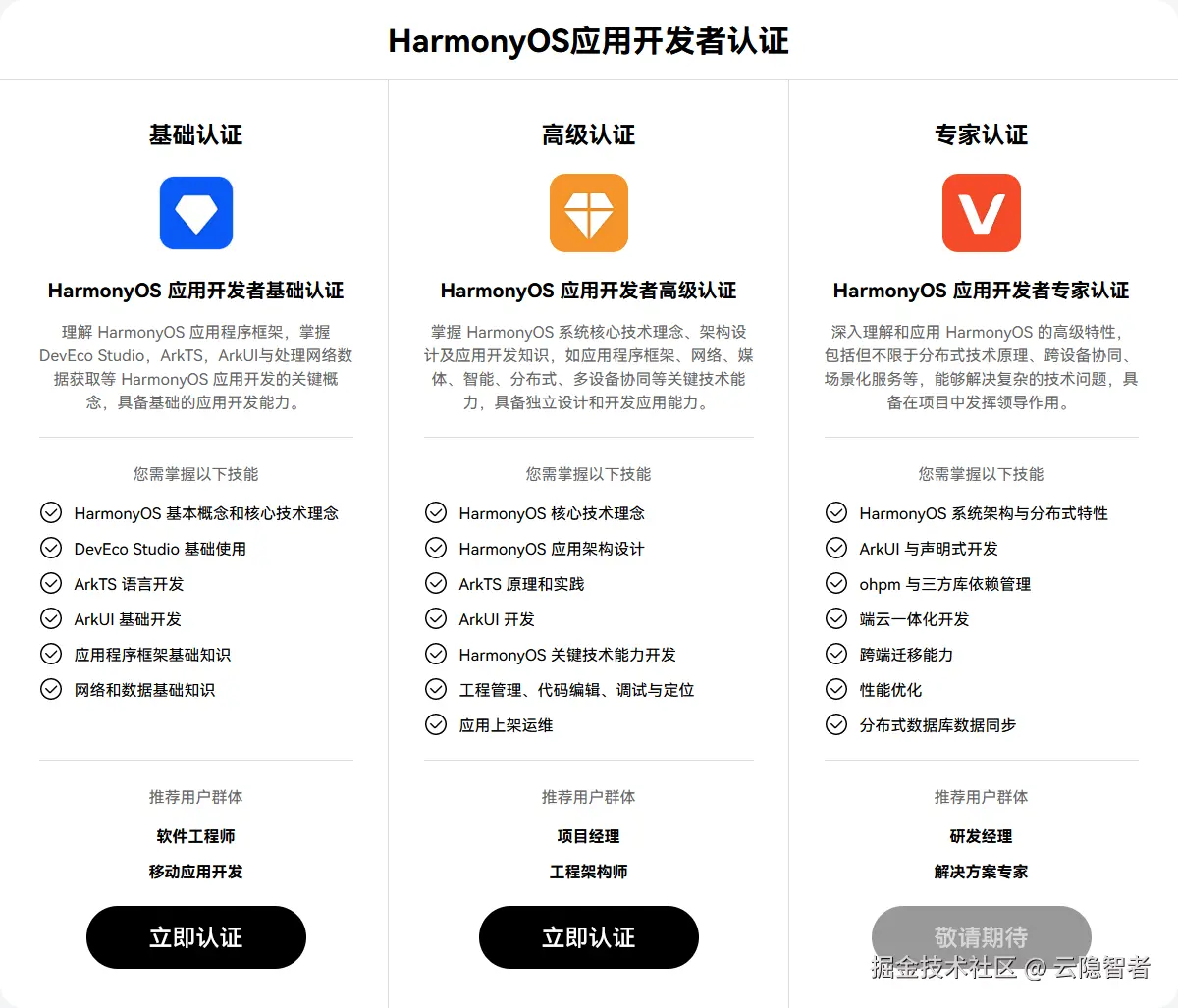 华为 HarmonyOS 应用开发者认证分为两个等级,逐级进阶,无强制报名门槛: