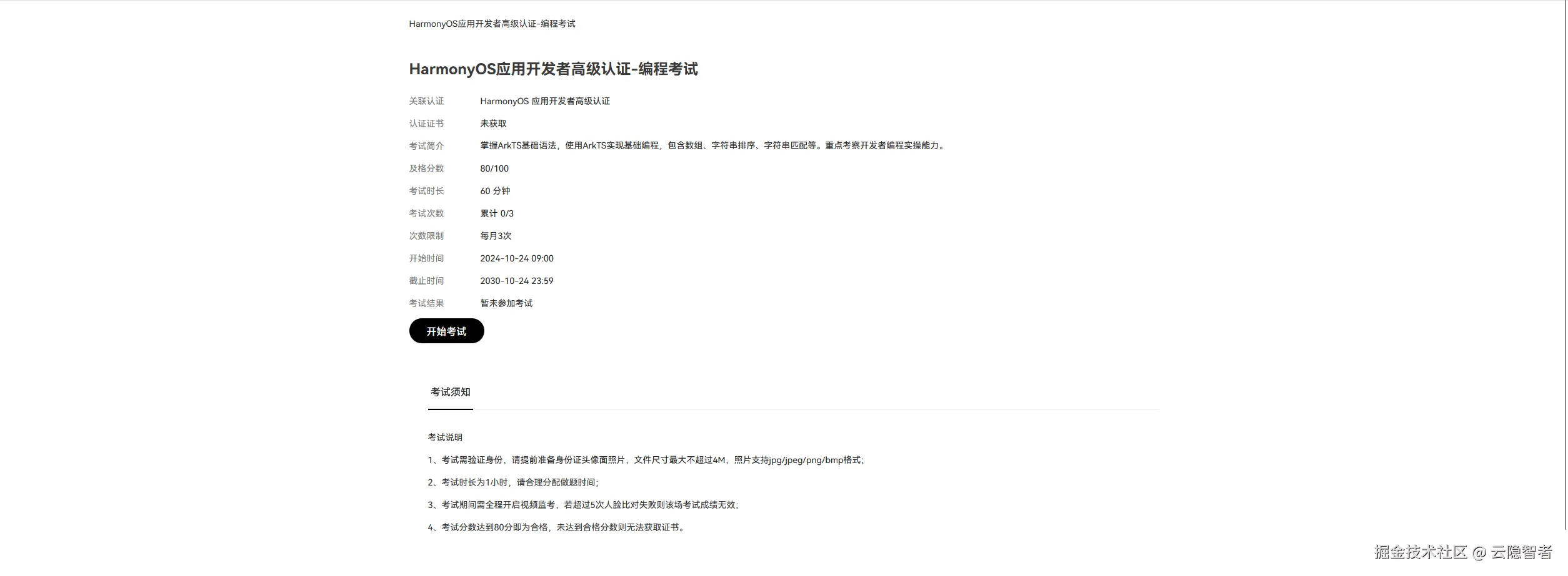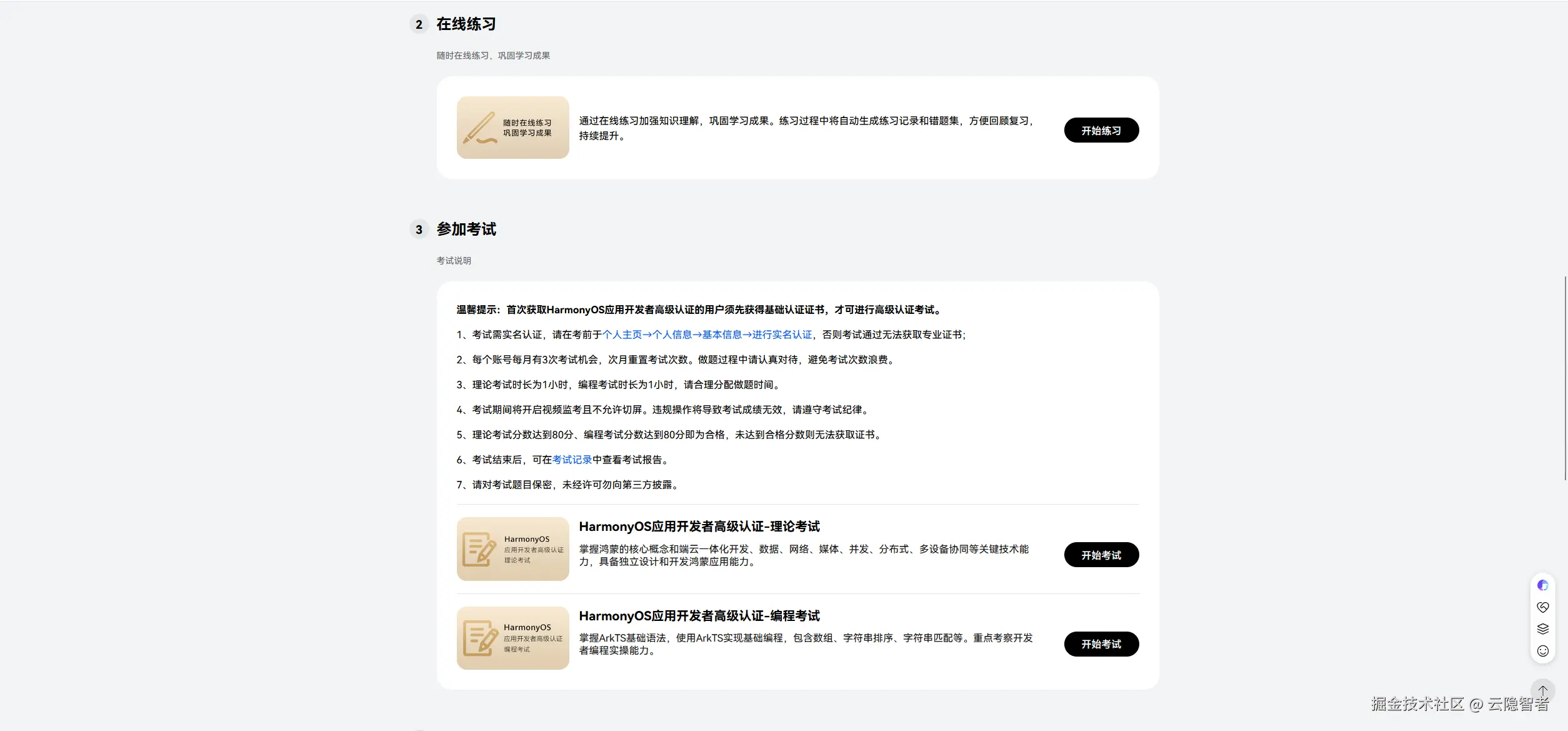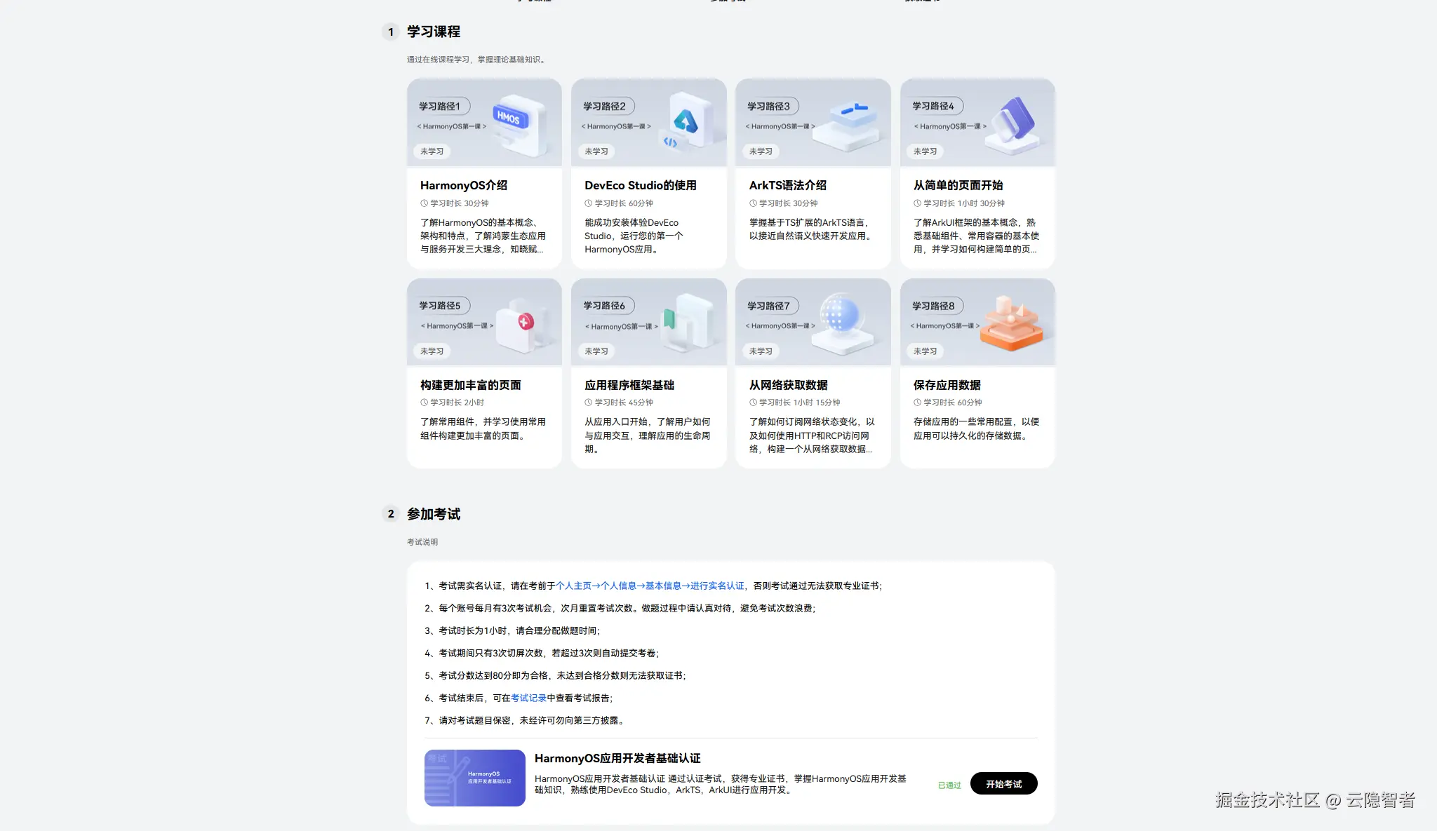 - 进入认证考试专区登录后,找到「认证与考试」-「HarmonyOS 应用开发者认证」,选择基础 / 高级认证。