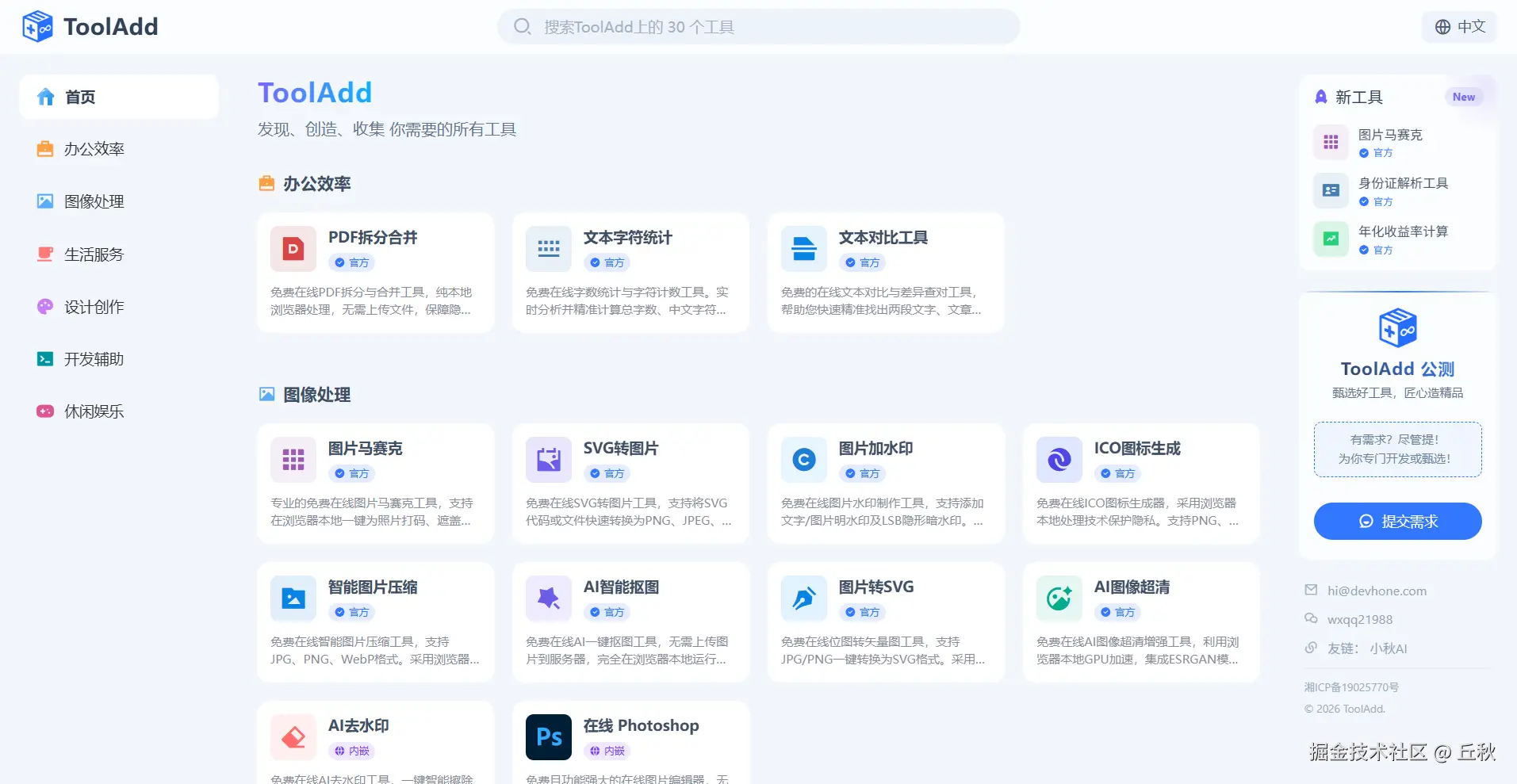 我是独立开发者丘秋,全新的独立产品 ToolAdd 是一个没有乱七八糟的广告、不用强迫注册、主打一个纯粹极致体验的在线工具箱!