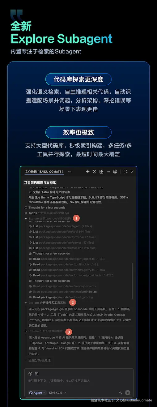 后端研发不需要先"学会前端"才能"做前端",Comate成了能力延伸的工具。 这次开发的关键在于Comate 4.0 Explore Subagent的深度检索能力。只需要一句"帮我找到 WebSearch 工具的实现",它就能从海量代码中精准检索出相关文件路径,并梳理出架构模式。原本需要人工逐层翻阅代码的调研时间,从半天压缩到几分钟。