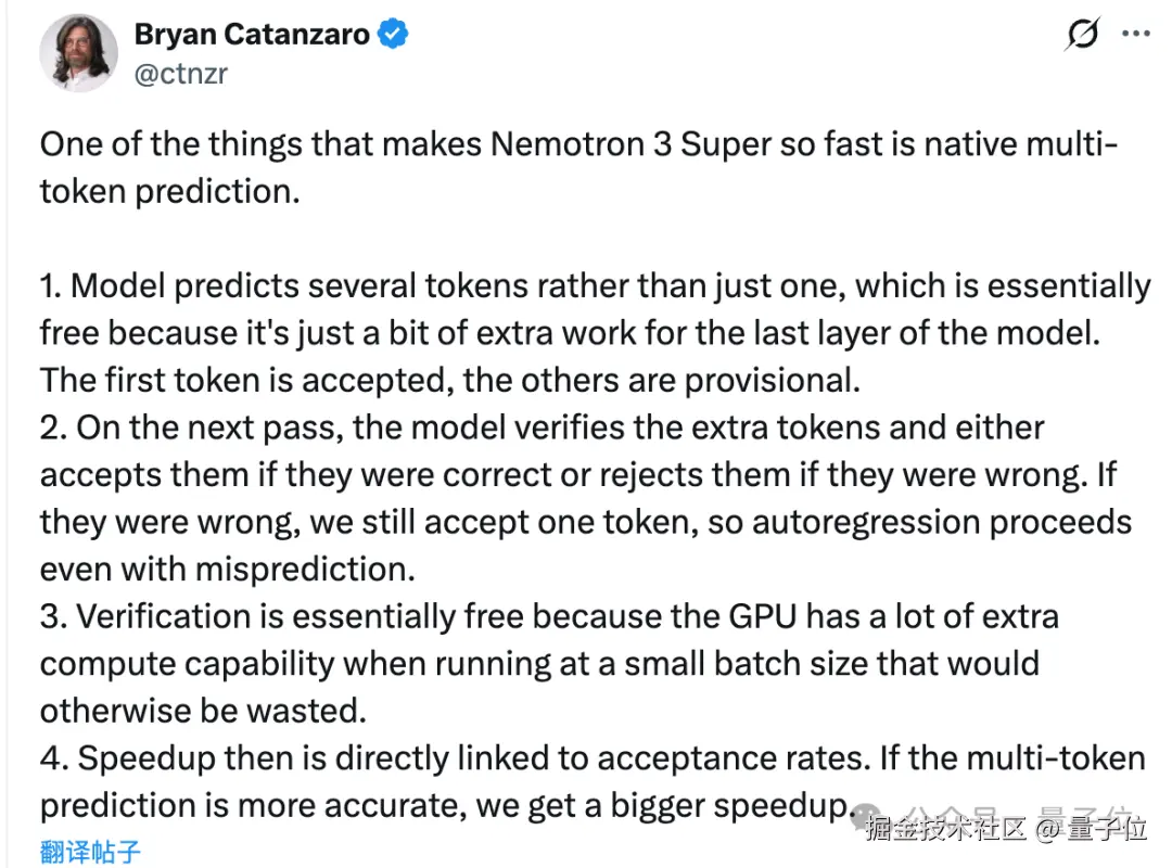 与逐个预测 token 的传统模式不同,Nemotron 3 Super 通过共享权重设计,在单次前向传递中即可并行预测未来的多个 token。