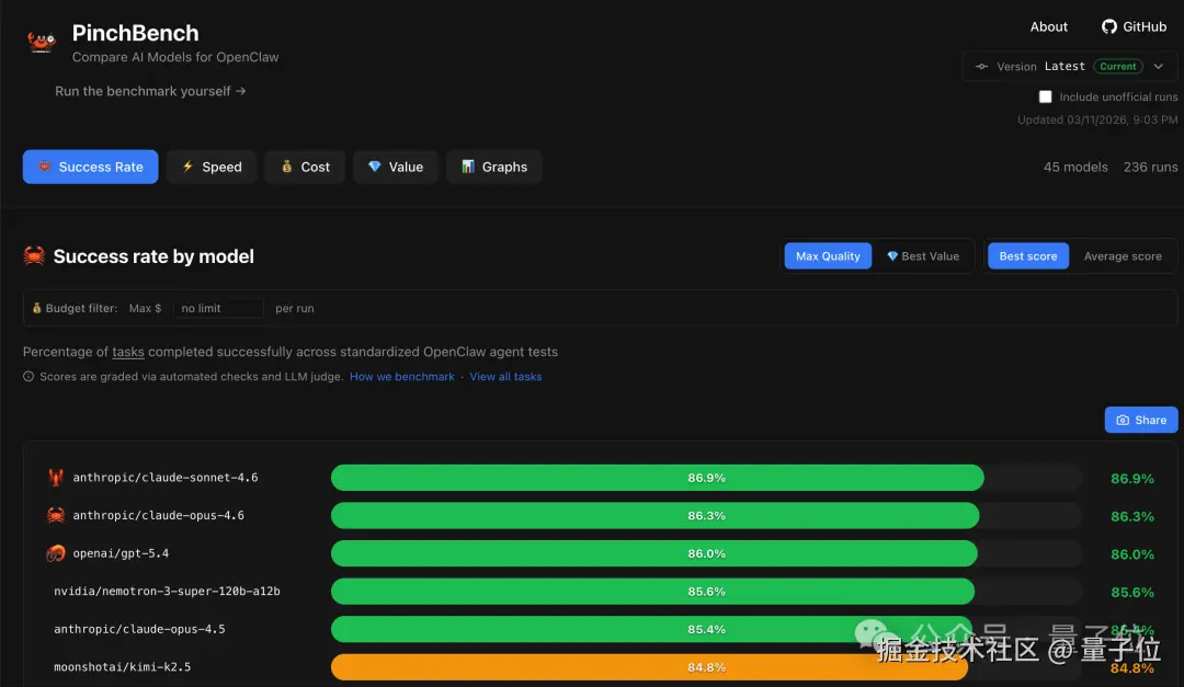 在评估 OpenClaw 智能体控制能力的 PinchBench 测试中,这个模型一举拿下 85.6% 的高分,强势空降同类开源模型榜首。
