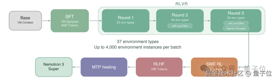 为了让 Nemotron 3 Super 真正具备执行任务的智能体能力,英伟达在后训练阶段通过多层级的加固策略对其进行了全方位打磨。