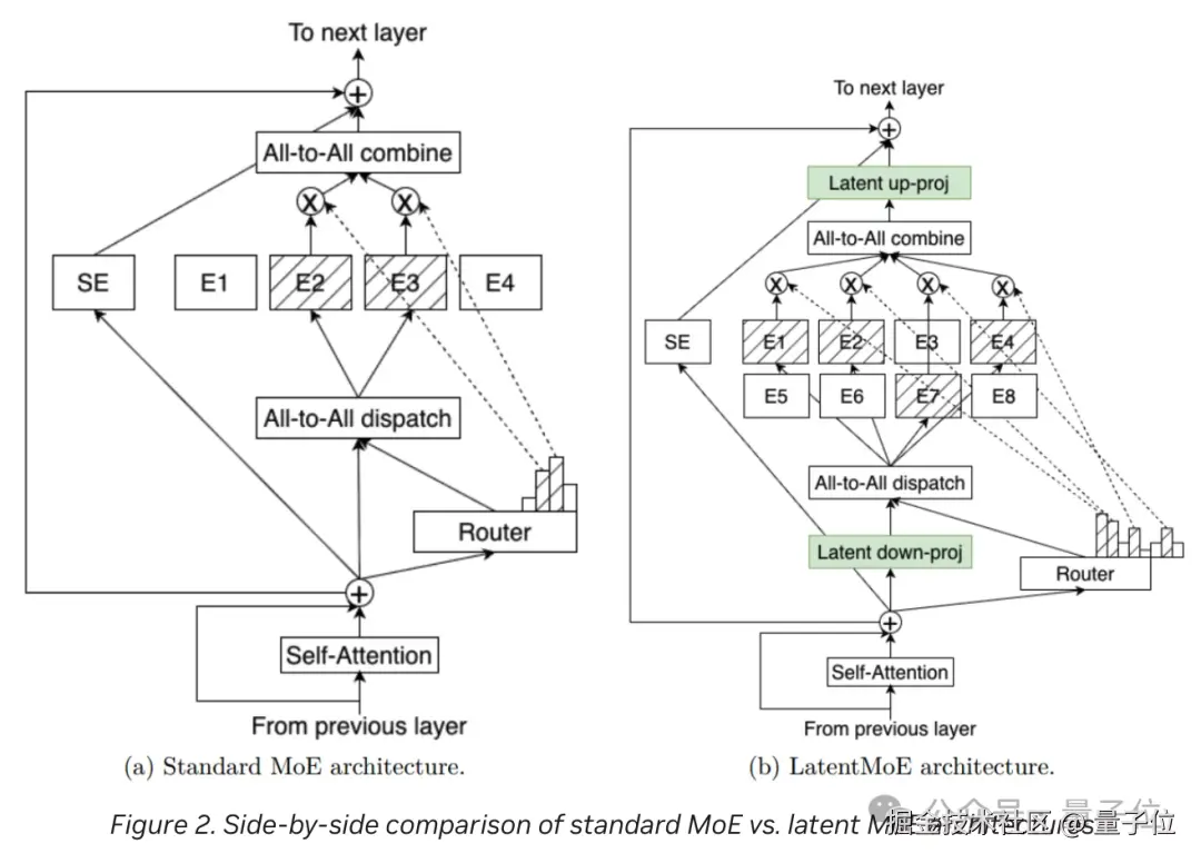 在模型规模的扩展上,为了解决传统混合专家架构在通信和计算上的瓶颈,模型引入了 Latent MoE 架构。