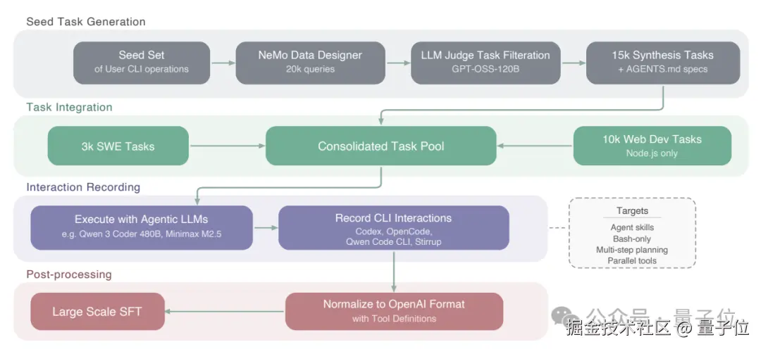 针对实际应用中的智能体命令行交互,英伟达构建了一个包含 2 万个初始查询的种子任务集,并利用模型作为裁判进行了精细过滤,最终沉淀出 1.5 万个核心合成任务。
