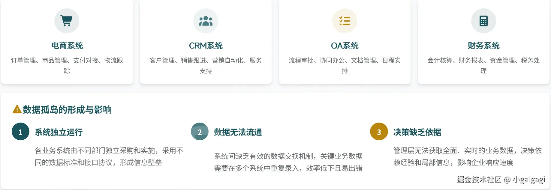 这些系统往往由不同部门、不同时期、不同供应商建设,数据标准不统一、接口协议各异、业务流程割裂,导致: