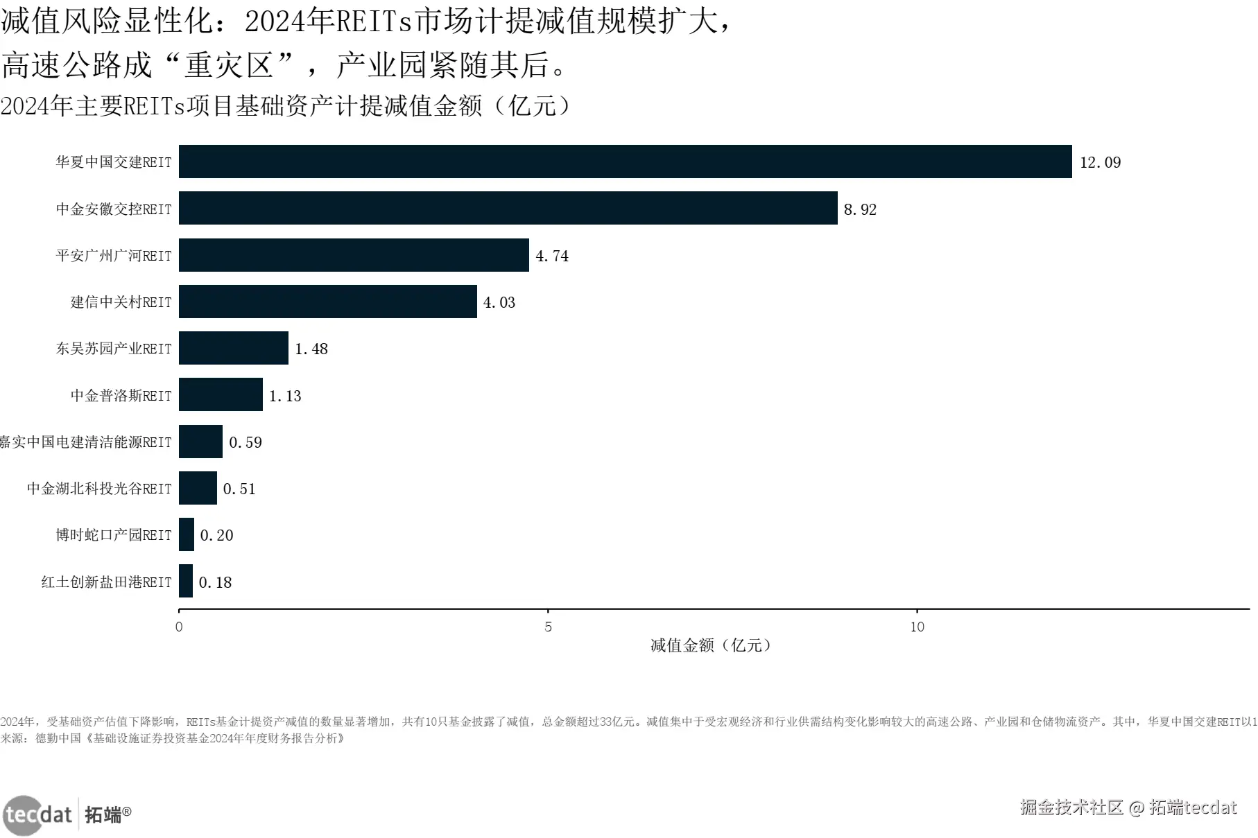 2024年,共有10只REITs基金披露了资产减值,总金额超过33亿元。华夏中国交建REIT以12.09亿元的减值额居首,高速公路成为“重灾区”。这提醒我们,减值不是简单的会计数字,而是真金白银的风险暴露。