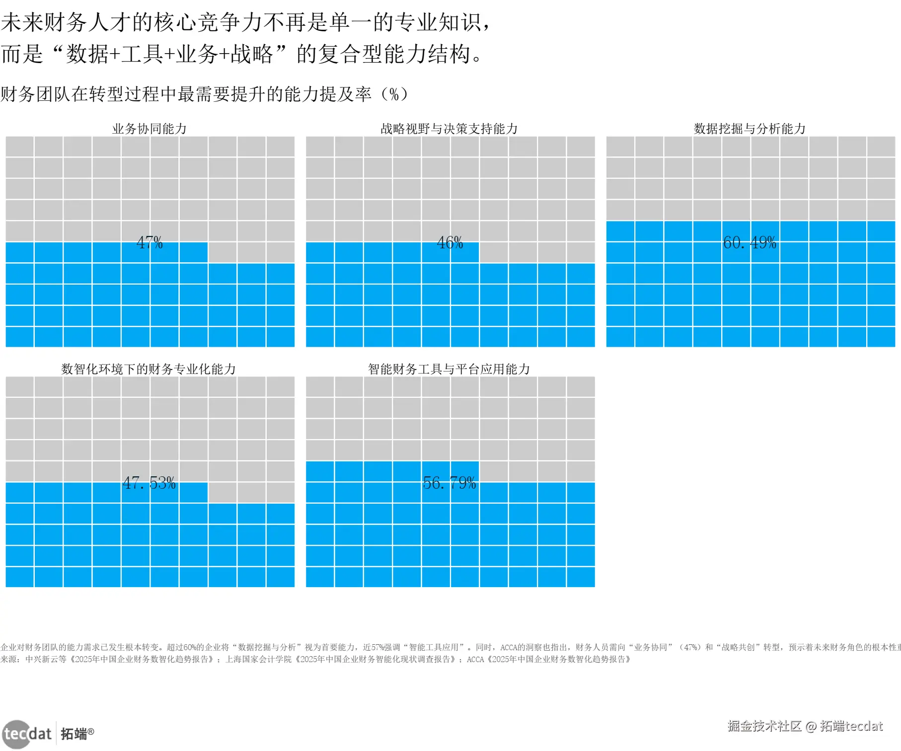 超过60%的企业认为“数据挖掘与分析能力”是财务团队最亟需提升的素质,近57%强调要会“智能工具应用”。这清晰地告诉我们,未来的财务人,不是只会做账的“账房先生”,而是要懂数据、会工具、能打仗的“业务参谋”。