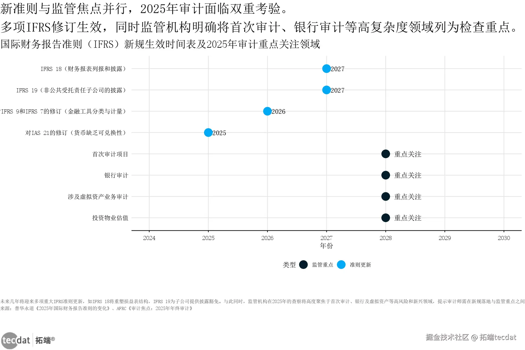 IFRS 18(财务报表列报和披露)将于2027年生效,它将重塑损益表结构。与此同时,2025年的审计重点已明确聚焦于首次审计、银行审计及虚拟资产业务。一边是准则迭代,一边是新风险涌现,审计师们压力山大。