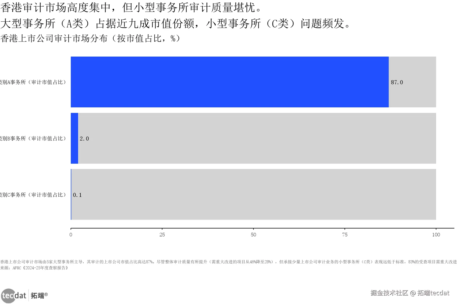 香港市场的数据极具代表性:5家大型事务所(A类)占据了87%的市值份额,但众多小型事务所(C类)中,83%的受查项目需要“重大改进”。规模与质量,在这里出现了明显的分层。