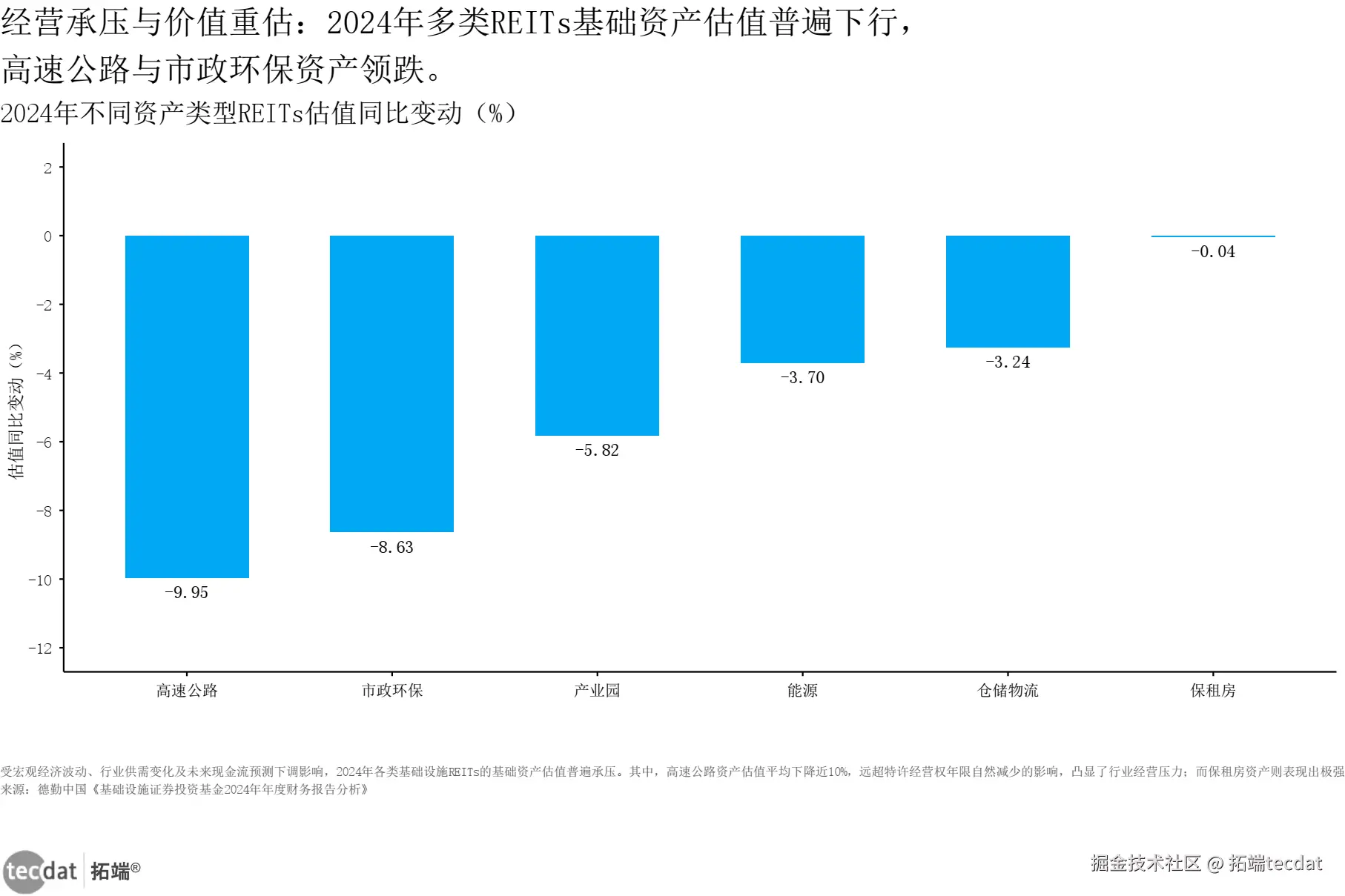2024年,高速公路资产估值平均下降9.95%,远超特许经营权年限自然减少的影响,折射出行业经营的真实压力。而保租房资产则表现出极强的抗周期性,估值基本持平。
