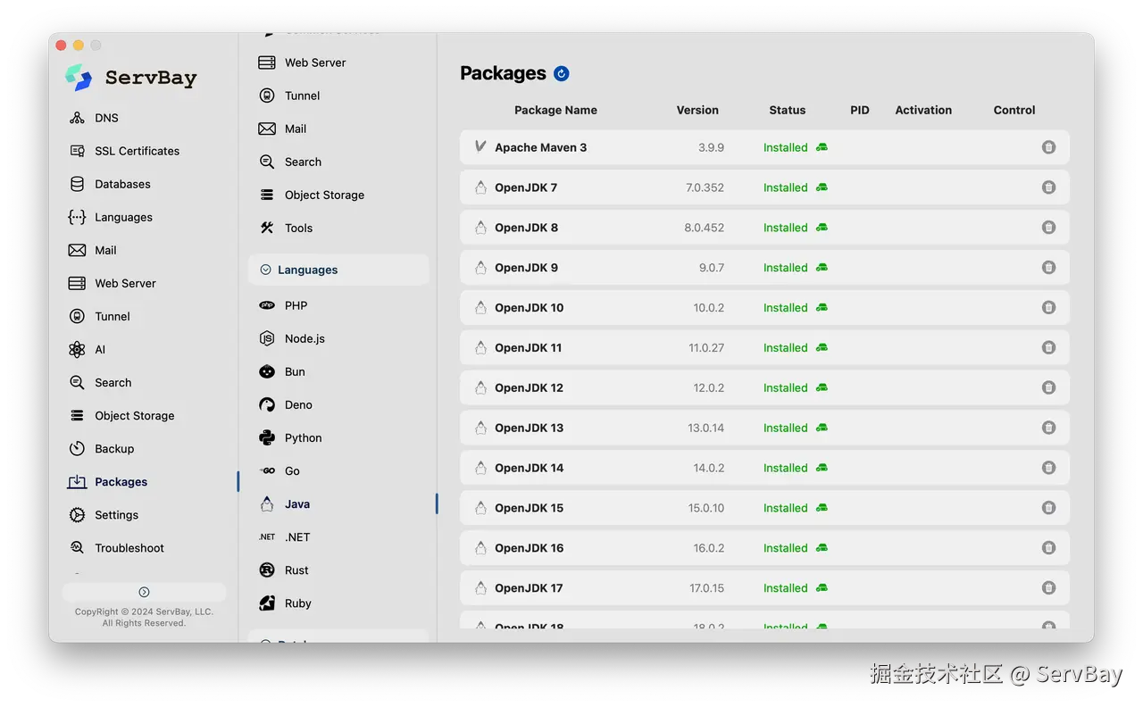用了 ServBay 就不同了,能一键安装 Java 环境不说,还能支持在同一台电脑上并行安装多个 JDK 版本,各个版本之间独立运行,互不干扰。那就可以根据不同的项目需求直接调用对应的环境,不再需要反复配置系统参数。
