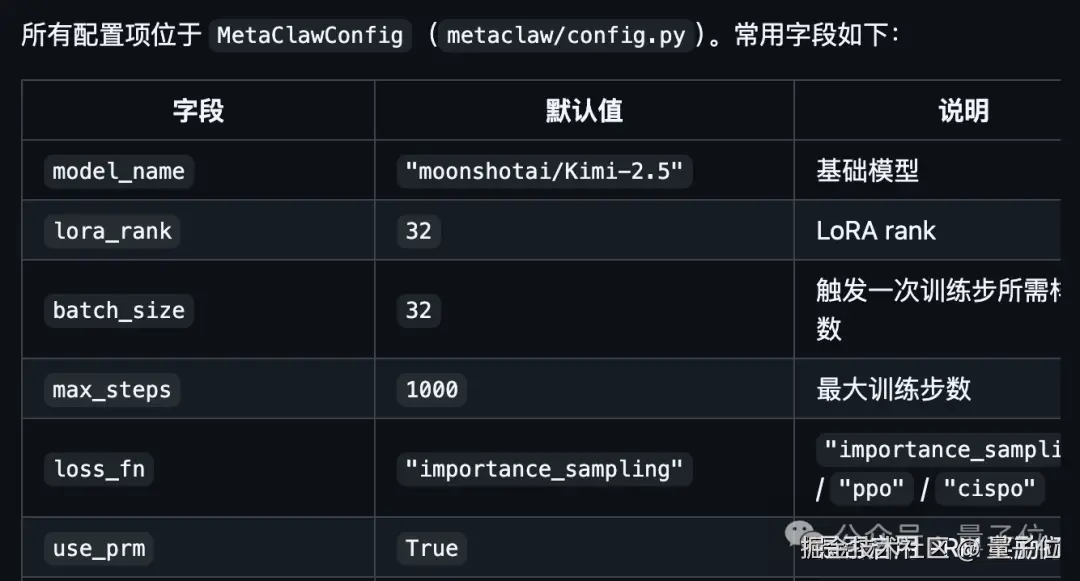 所有配置项都集中在 MetaClawConfig 中,包括模型选择、LoRA 参数、批次大小、训练步数、损失函数类型等,一目了然。
