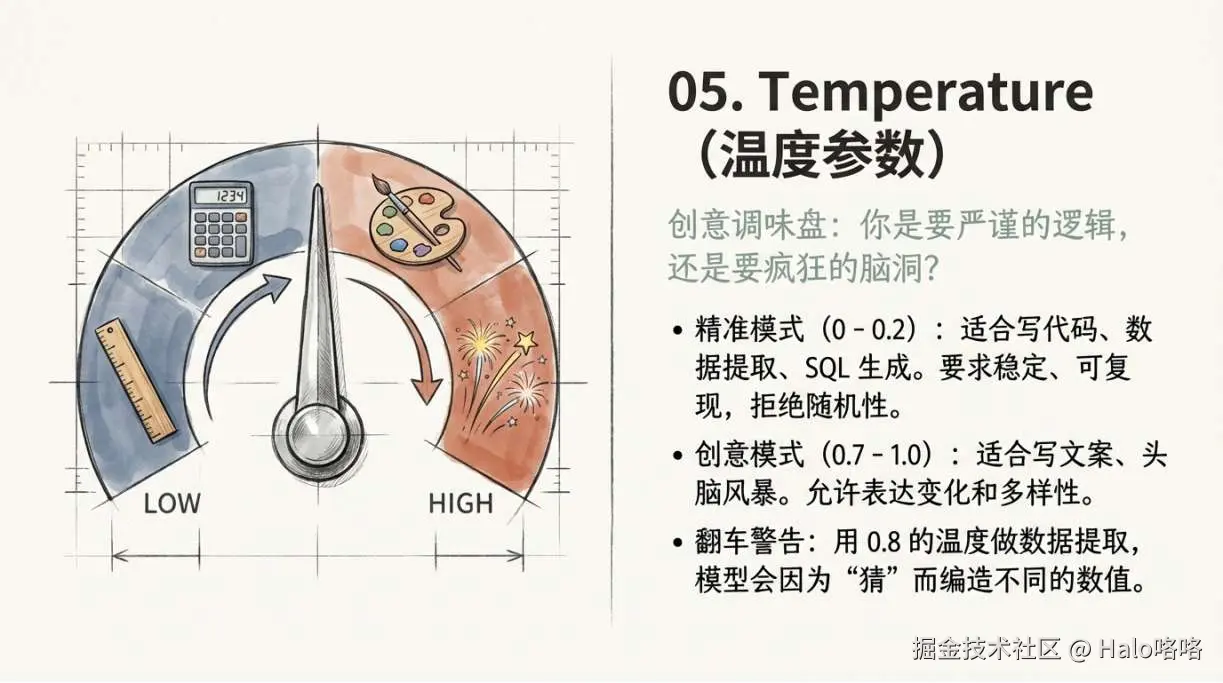 典型翻车场景: 用 temperature 0.8 做数据提取,同一段文本跑两次,提取出来的字段值不一样——因为模型在"猜"不确定的内容时加入了随机性。把 temperature 调到 0,问题消失。