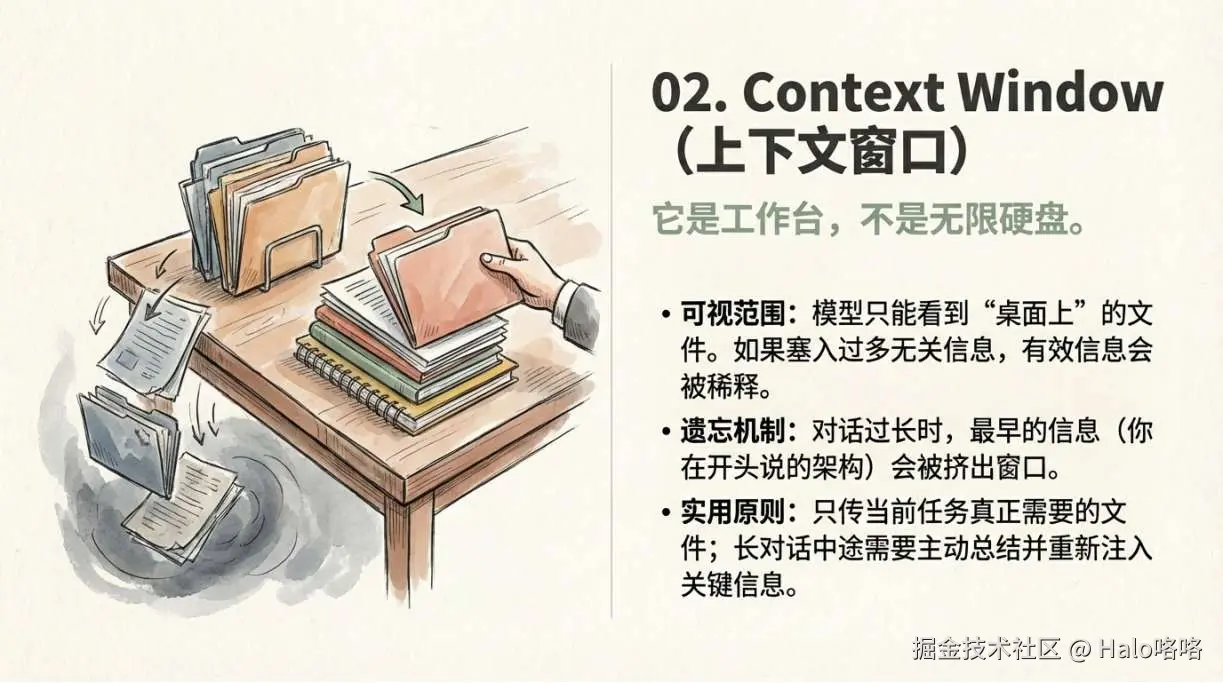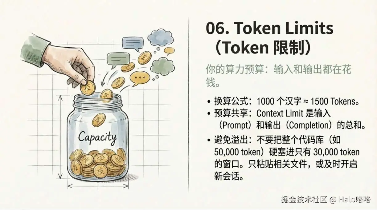 - 长对话要及时开新会话,避免历史记录把窗口撑满