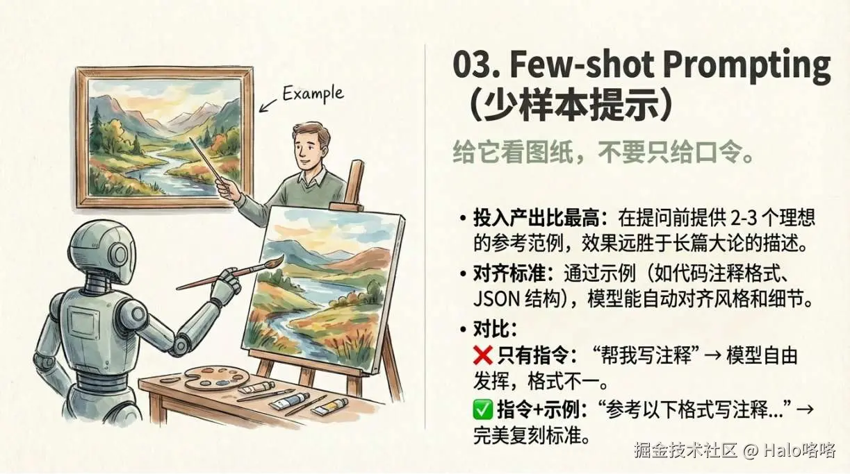 在让模型做正式任务之前,先给它看 2-3 个你期望的例子。 这是提升输出质量投入产出比最高的方式。