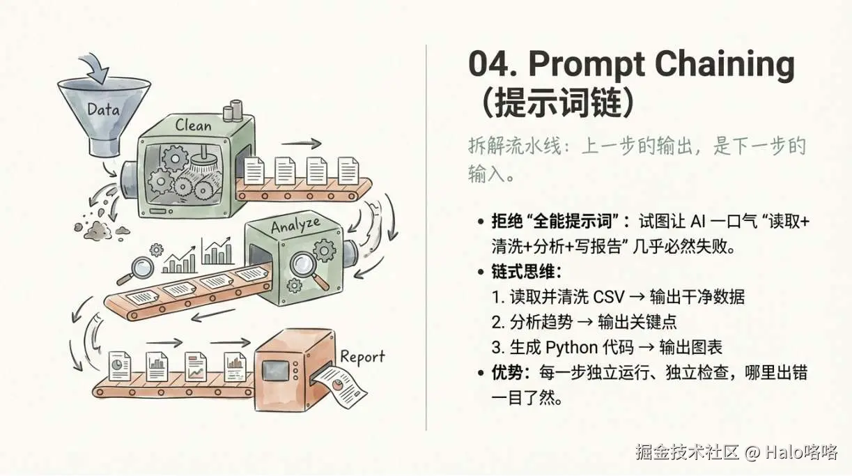一个提示词只做一件事。 大任务拆成链,上一步的输出是下一步的输入。