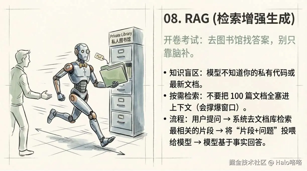模型只知道训练数据里有的东西,你的业务文档、最新 API 文档、私有代码库——它一概不知。RAG 是标准解法。