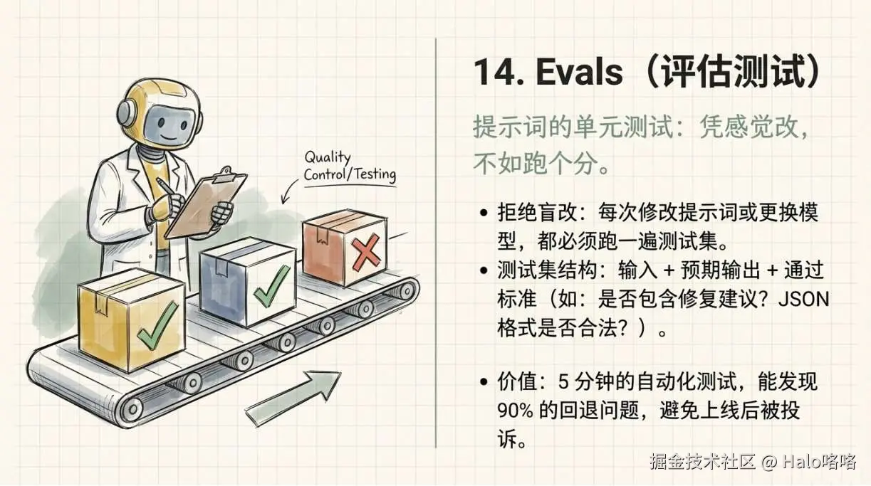 Evals 是 AI 层的单元测试:给定输入,有明确的预期输出,每次改了提示词就跑一遍。