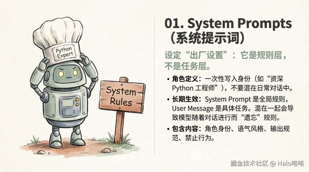 System prompt 是规则层,user message 是任务层,不要混在一起。